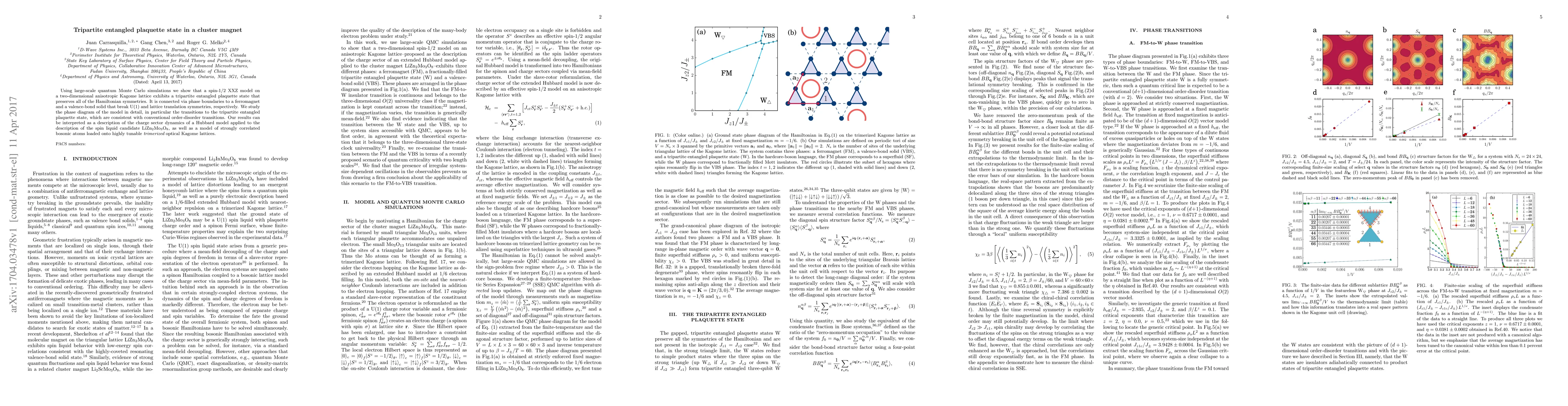 This paper demonstrates a tripartite entangled plaquette state in a spin-$1/2$ XXZ model on a Kagome lattice using quantum Monte Carlo simulations, showing it connects to ferromagnetic and valence-bond solid phases via phase boundaries. The findings describe the charge dynamics in spin liquid candidates and bosonic atoms in optical lattices.