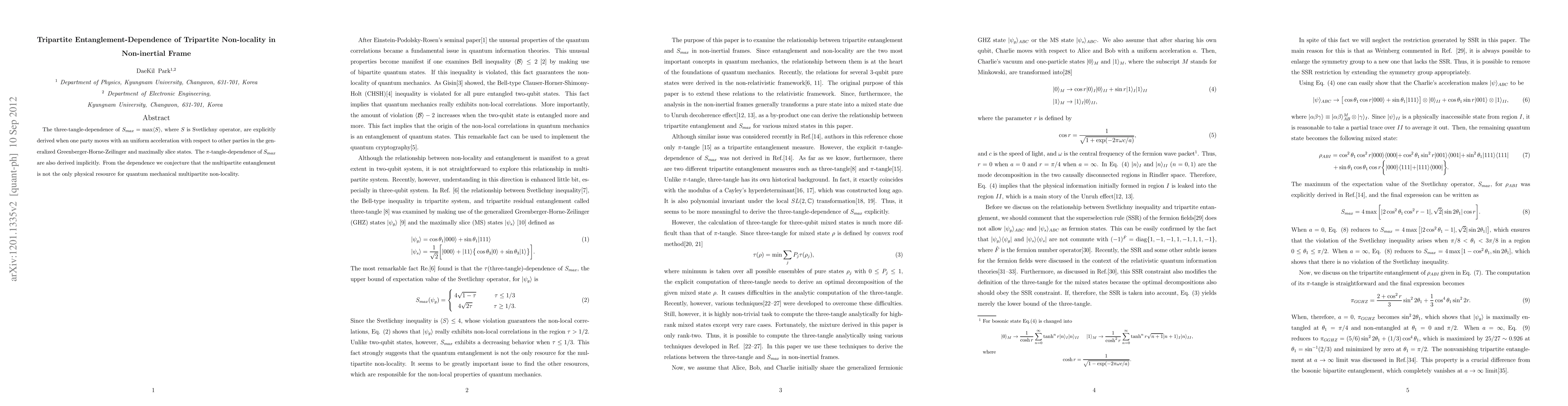 This paper derives the three-tangle-dependence of the maximum Svetlichny operator $S_{max}$ in non-inertial frames, showing that tripartite non-locality in quantum mechanics is not solely dependent on multipartite entanglement. The study considers scenarios where one party moves with uniform acceleration relative to others.