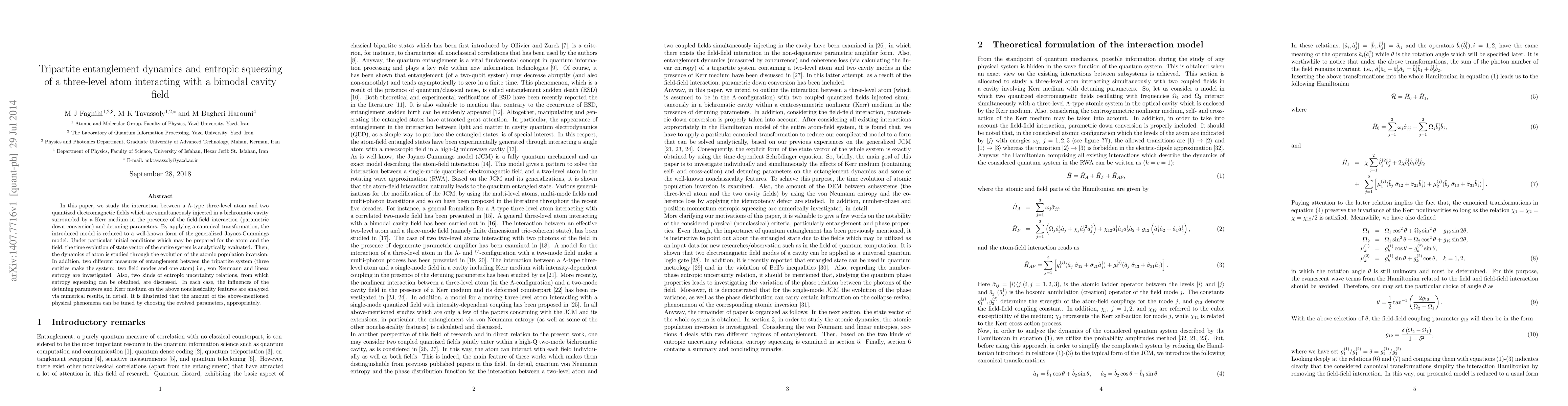 This paper investigates the dynamics of a $\Lambda$-type three-level atom interacting with two quantized electromagnetic fields in a bichromatic cavity with Kerr medium. The study analyzes tripartite entanglement and entropic squeezing, showing how detuning parameters and Kerr medium influence these phenomena, which can be tuned by adjusting system parameters.