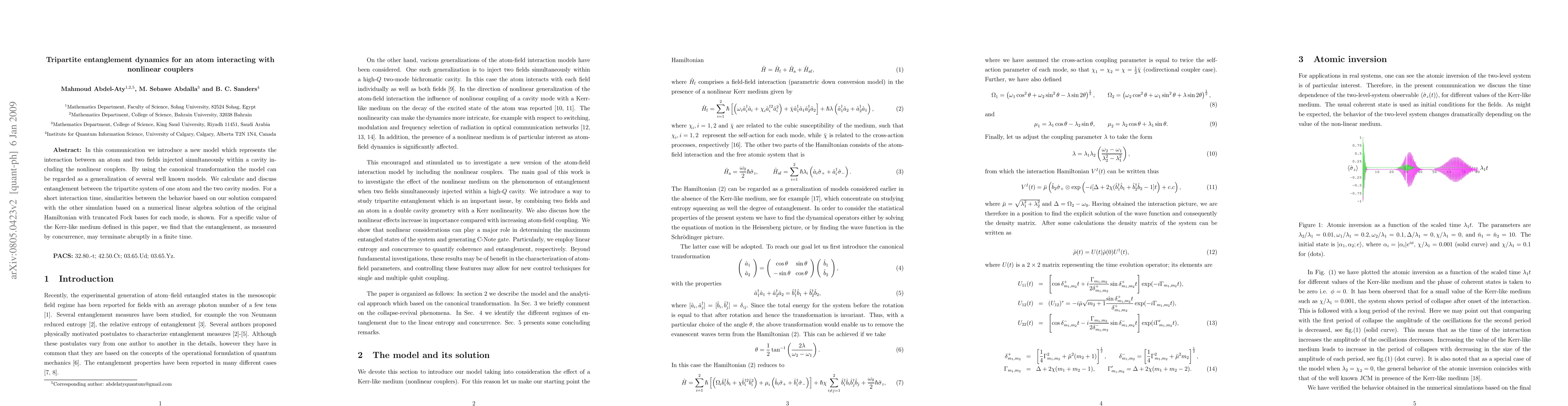 In this communication we introduce a new model which represents the interaction between an atom and two fields injected simultaneously within a cavity including the nonlinear couplers. By using the canonical transformation the model can be regarded as a generalization of several well-known models. We calculate and discuss entanglement between the tripartite system of one atom and the two cavity modes. For a short interaction time, similarities between the behavior based on our solution compared with the other simulation based on a numerical linear algebra solution of the original Hamiltonian with truncated Fock bases for each mode, is shown. For a specific value of the Kerr-like medium defined in this letter, we find that the entanglement, as measured by concurrence, may terminate abruptly in a finite time.