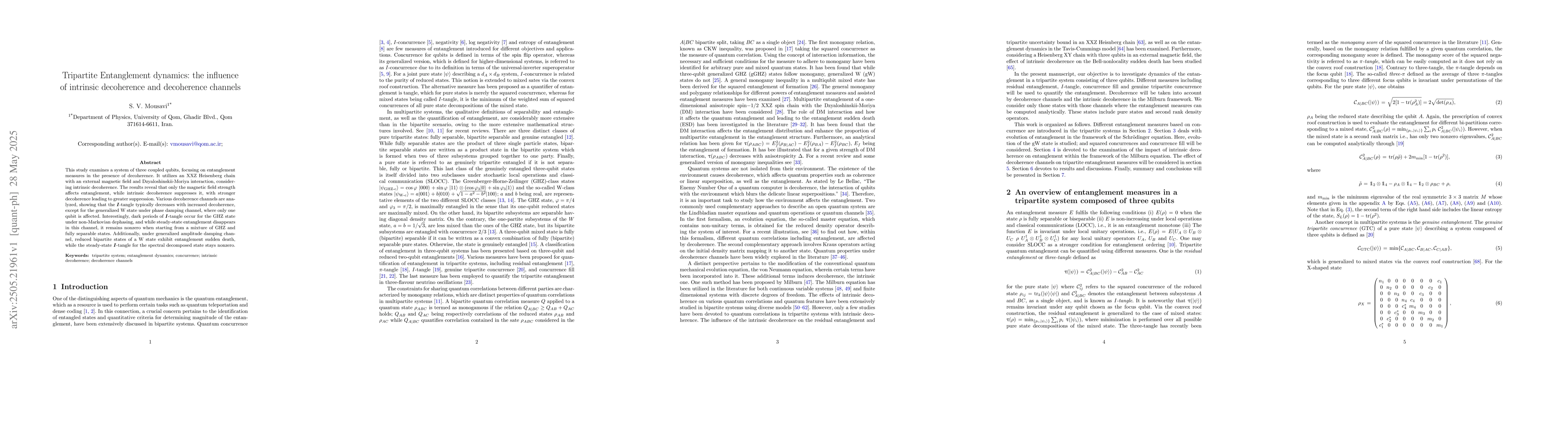 The paper presents a detailed analysis of tripartite entanglement dynamics under intrinsic decoherence and various decoherence channels, providing insights into how different factors influence entanglement in quantum systems.