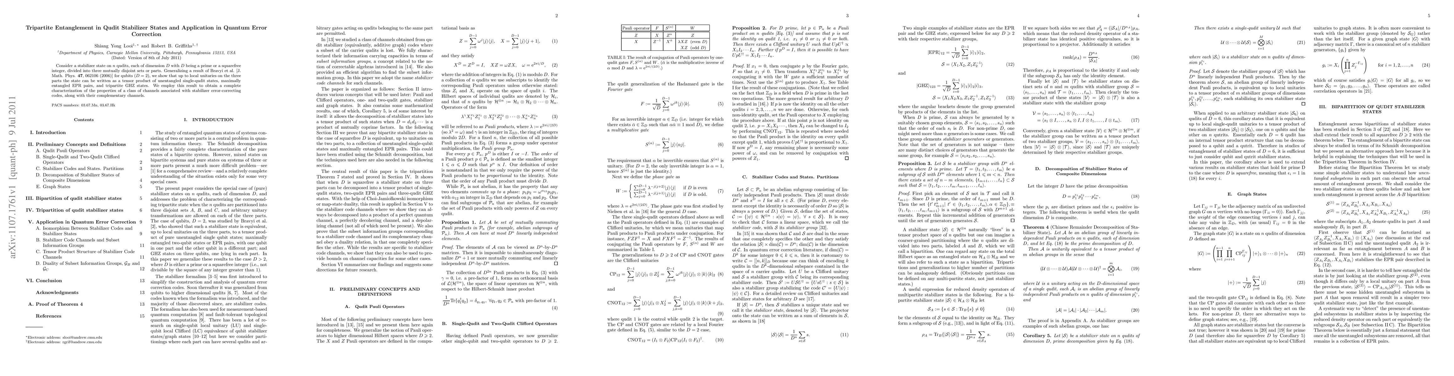 Consider a stabilizer state on $n$ qudits, each of dimension $D$ with $D$ being a prime or a squarefree integer, divided into three mutually disjoint sets or parts. Generalizing a result of Bravyi et al. [J. Math. Phys. \textbf{47}, 062106 (2006)] for qubits (D=2), we show that up to local unitaries on the three parts the state can be written as a tensor product of unentangled single-qudit states, maximally entangled EPR pairs, and tripartite GHZ states. We employ this result to obtain a complete characterization of the properties of a class of channels associated with stabilizer error-correcting codes, along with their complementary channels.