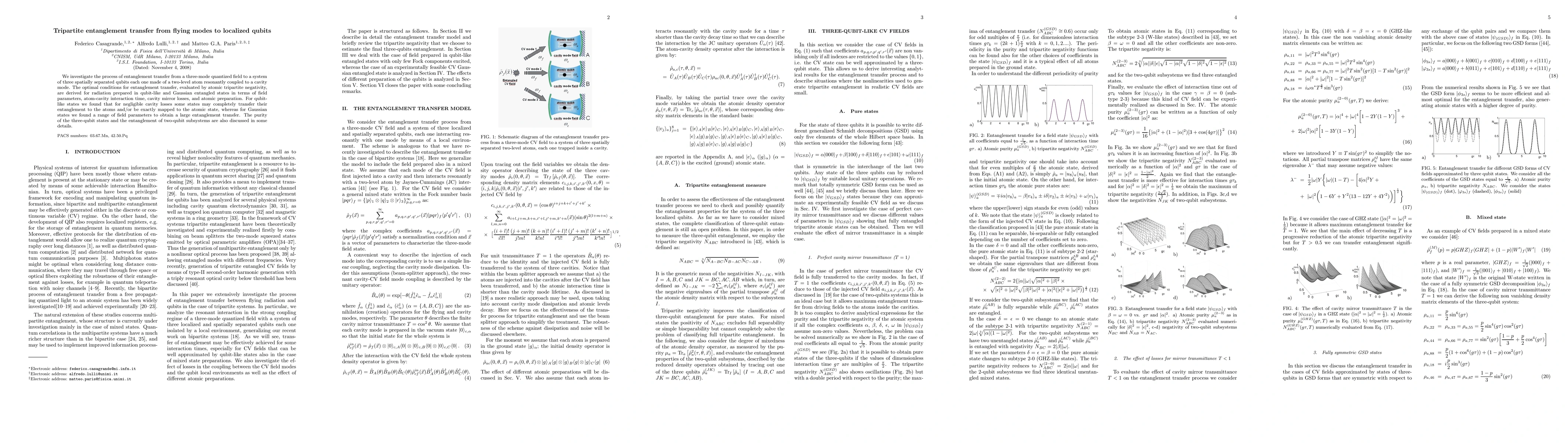 This paper explores the transfer of tripartite entanglement from a three-mode quantized field to a system of three spatially separated qubits, each consisting of a two-level atom resonantly coupled to a cavity. The study derives optimal conditions for entanglement transfer, highlighting that qubit-like states can fully transfer their entanglement under certain conditions, while Gaussian states require specific field parameters for significant entanglement transfer.