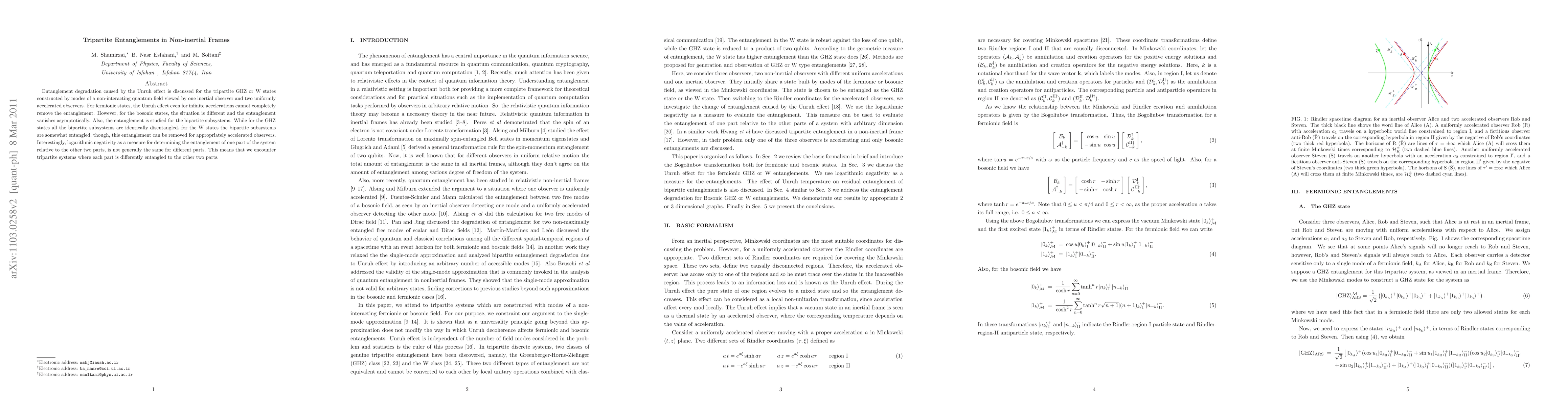 This paper investigates entanglement degradation in tripartite GHZ and W states due to the Unruh effect in non-inertial frames. It finds that while fermionic states retain some entanglement even at infinite accelerations, bosonic states lose entanglement asymptotically. Bipartite subsystems in GHZ states are fully disentangled, whereas W states show partial entanglement that can be removed by specific accelerations. Logarithmic negativity reveals differing entanglement levels among the tripartite subsystems.