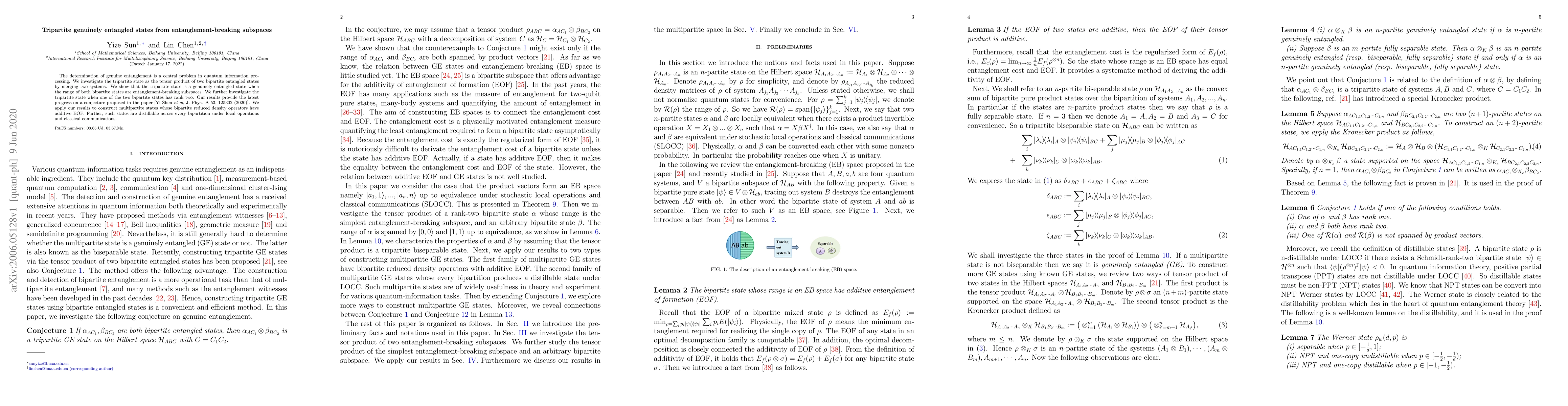 This paper explores the creation of genuinely entangled tripartite quantum states from bipartite entangled states, demonstrating that such states arise when both bipartite states lie within entanglement-breaking subspaces. The authors also extend their findings to cases where one bipartite state has rank two, supporting a conjecture from a related study, and show that these states are distillable across all bipartitions.