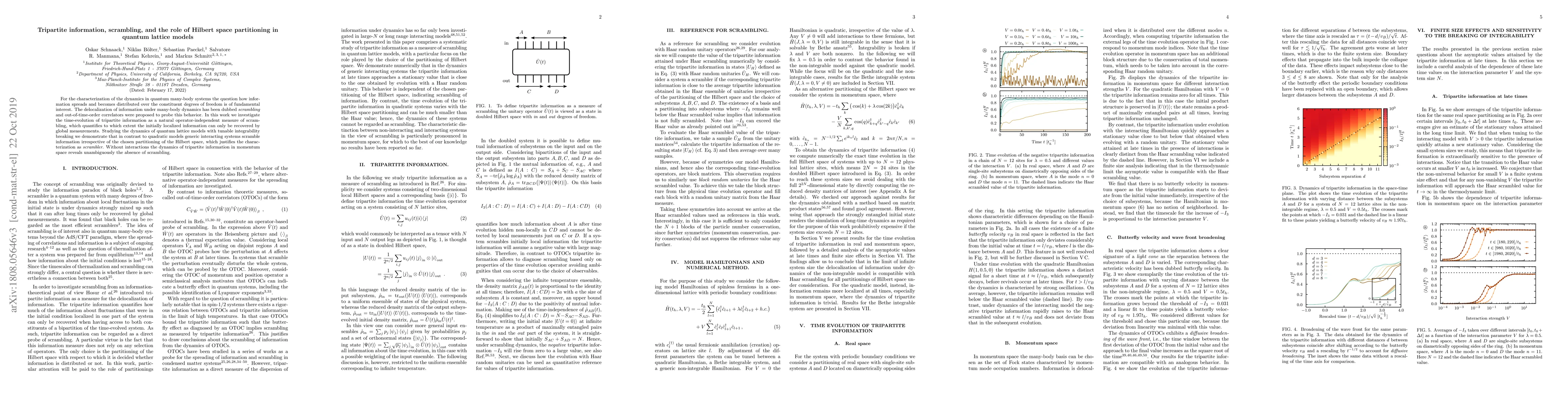 For the characterization of the dynamics in quantum many-body systems the question how information spreads and becomes distributed over the constituent degrees of freedom is of fundamental interest. The delocalization of information under many-body dynamics has been dubbed scrambling and out-of-time-order correlators were proposed to probe this behavior. In this work we investigate the time-evolution of tripartite information as a natural operator-independent measure of scrambling, which quantifies to which extent the initially localized information can only be recovered by global measurements. Studying the dynamics of quantum lattice models with tunable integrability breaking we demonstrate that in contrast to quadratic models generic interacting systems scramble information irrespective of the chosen partitioning of the Hilbert space, which justifies the characterization as scrambler. Without interactions the dynamics of tripartite information in momentum space reveals unambiguously the absence of scrambling.