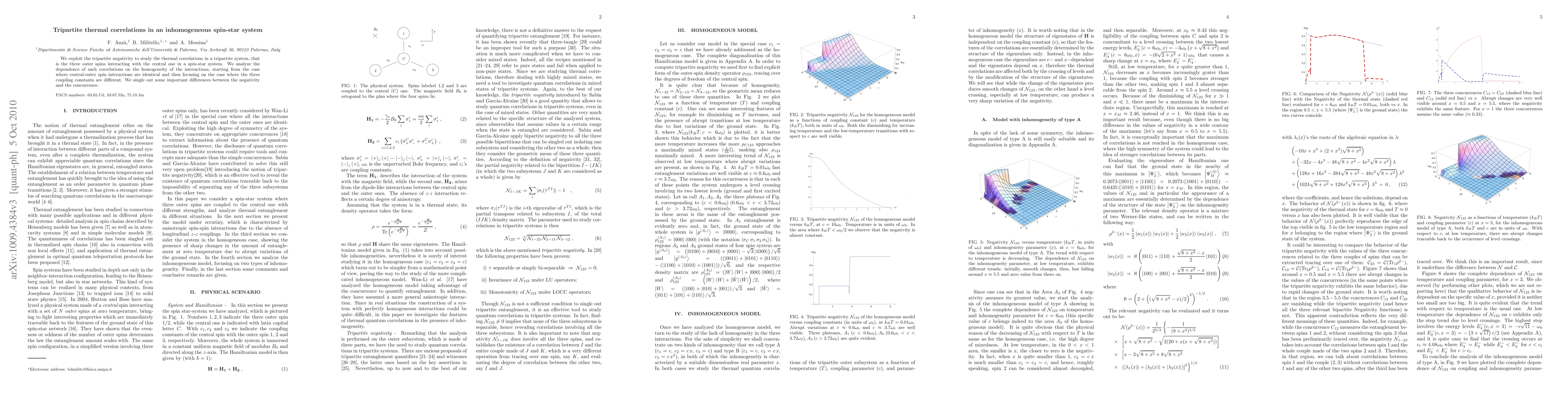 We exploit the tripartite negativity to study the thermal correlations in a tripartite system, that is the three outer spins interacting with the central one in a spin-star system. We analyze the dependence of such correlations on the homogeneity of the interactions, starting from the case where central-outer spin interactions are identical and then focusing on the case where the three coupling constants are different. We single out some important differences between the negativity and the concurrence.