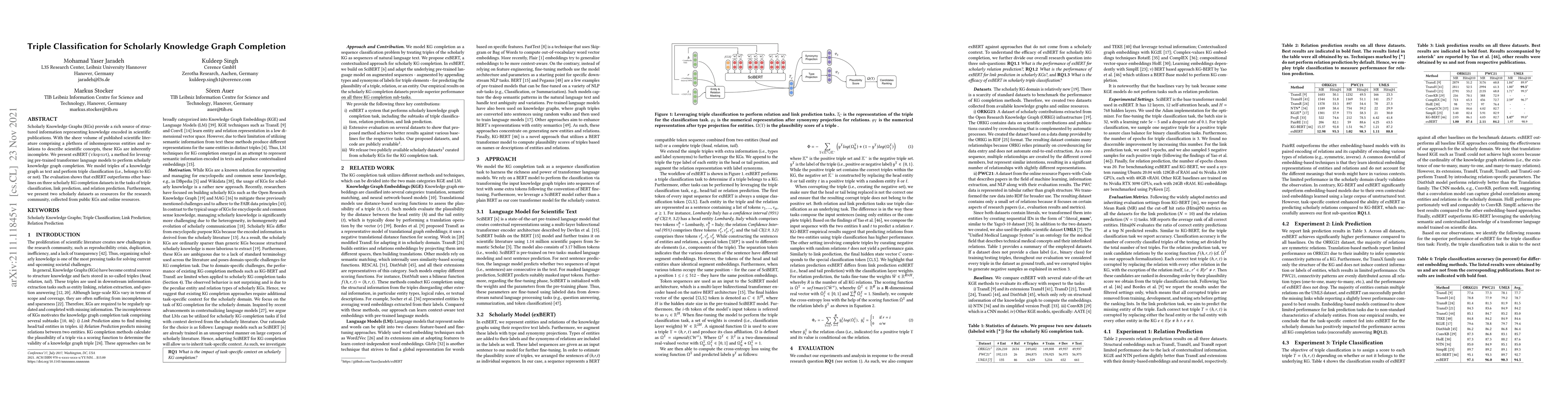 The paper introduces exBERT, a method using pre-trained transformer models to complete scholarly Knowledge Graphs by classifying triples. It outperforms baselines in triple classification, link prediction, and relation prediction, and contributes two new datasets for research.