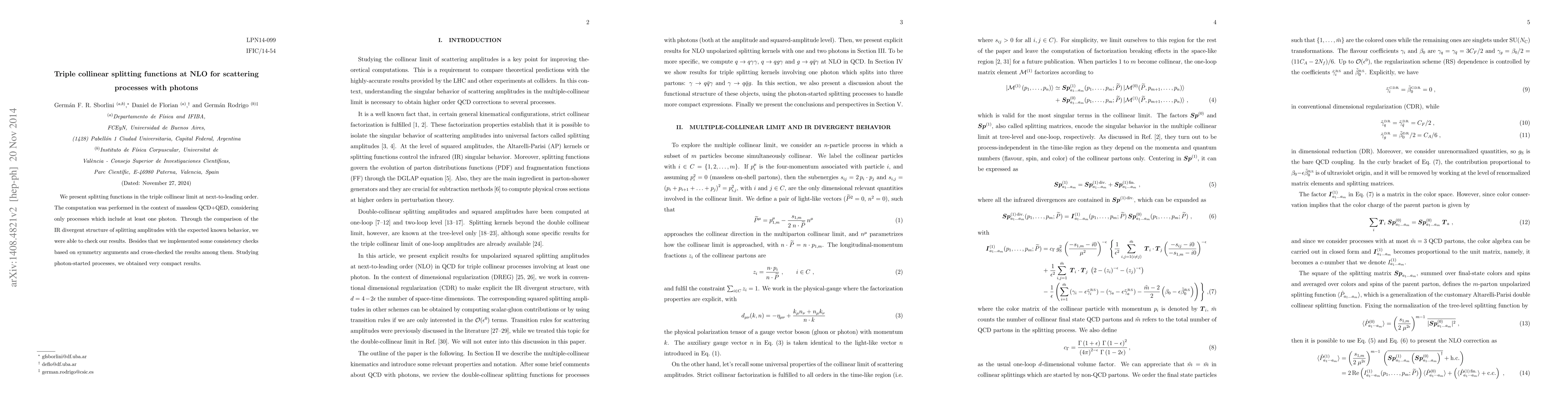 We present splitting functions in the triple collinear limit at next-to-leading order. The computation was performed in the context of massless QCD+QED, considering only processes which include at least one photon. Through the comparison of the IR divergent structure of splitting amplitudes with the expected known behavior, we were able to check our results. Besides that we implemented some consistency checks based on symmetry arguments and cross-checked the results among them. Studying photon-started processes, we obtained very compact results.