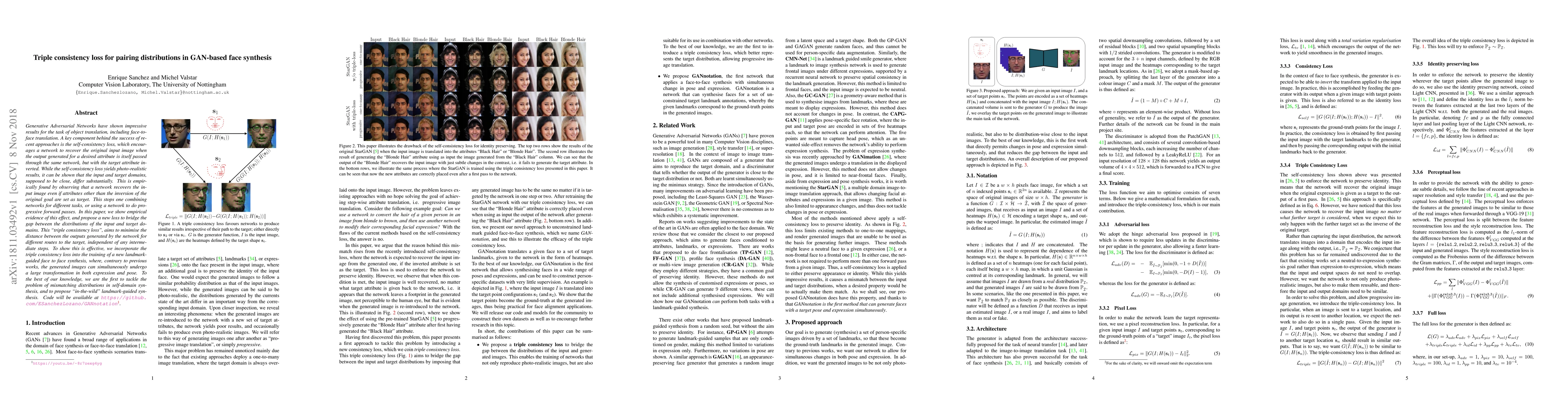 Generative Adversarial Networks have shown impressive results for the task of object translation, including face-to-face translation. A key component behind the success of recent approaches is the self-consistency loss, which encourages a network to recover the original input image when the output generated for a desired attribute is itself passed through the same network, but with the target attribute inverted. While the self-consistency loss yields photo-realistic results, it can be shown that the input and target domains, supposed to be close, differ substantially. This is empirically found by observing that a network recovers the input image even if attributes other than the inversion of the original goal are set as target. This stops one combining networks for different tasks, or using a network to do progressive forward passes. In this paper, we show empirical evidence of this effect, and propose a new loss to bridge the gap between the distributions of the input and target domains. This "triple consistency loss", aims to minimise the distance between the outputs generated by the network for different routes to the target, independent of any intermediate steps. To show this is effective, we incorporate the triple consistency loss into the training of a new landmark-guided face to face synthesis, where, contrary to previous works, the generated images can simultaneously undergo a large transformation in both expression and pose. To the best of our knowledge, we are the first to tackle the problem of mismatching distributions in self-domain synthesis, and to propose "in-the-wild" landmark-guided synthesis. Code will be available at https://github.com/ESanchezLozano/GANnotation
