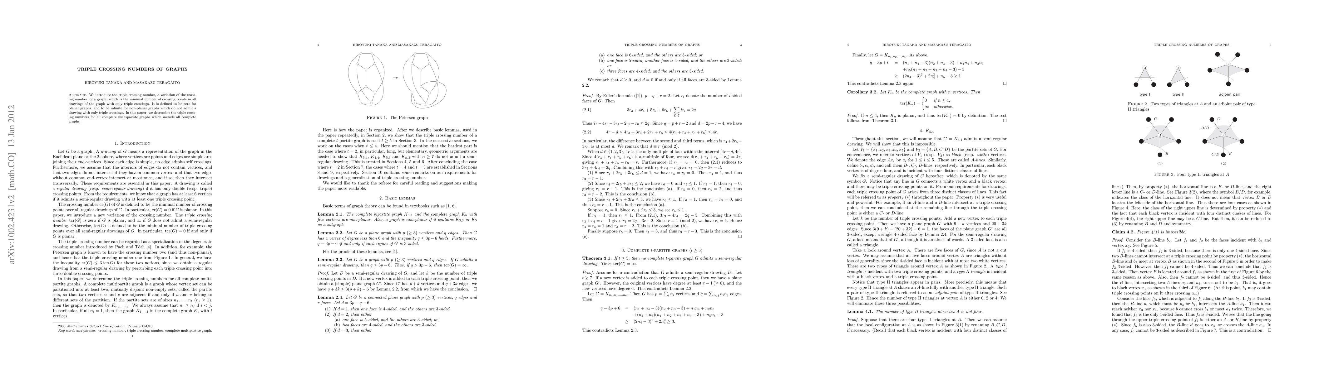 This paper introduces the triple crossing number for graphs, defined as the minimal number of crossing points in drawings allowing only triple crossings. It determines the triple crossing numbers for all complete multipartite graphs, including complete graphs.