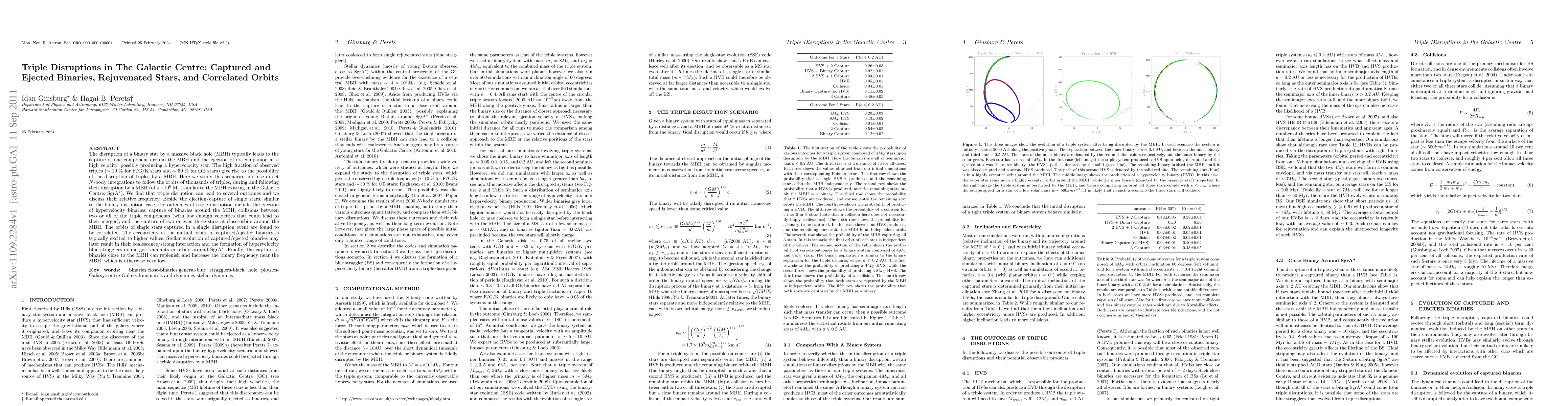 This paper explores the complex outcomes of triple star systems disrupted by a massive black hole (MBH) in the Galactic Centre, using $N$-body simulations. It finds that disruptions can lead to various outcomes including ejection of hypervelocity stars or binaries, capture of stars or binaries around the MBH, and even collisions that may result in mergers. The study highlights the correlated orbits of captured stars and the potential for increased binary frequency near the MBH.