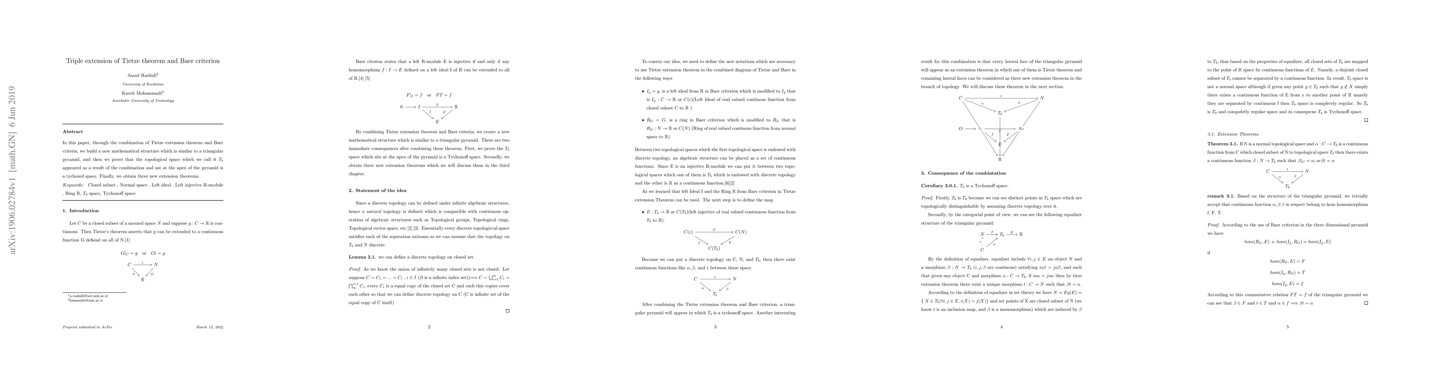 This paper combines Tietze extension theorem and Baer criterion to construct a new mathematical structure resembling a triangular pyramid, proving that the resulting topological space, termed Tb, is a Tychonoff space, and deriving three new extension theorems.