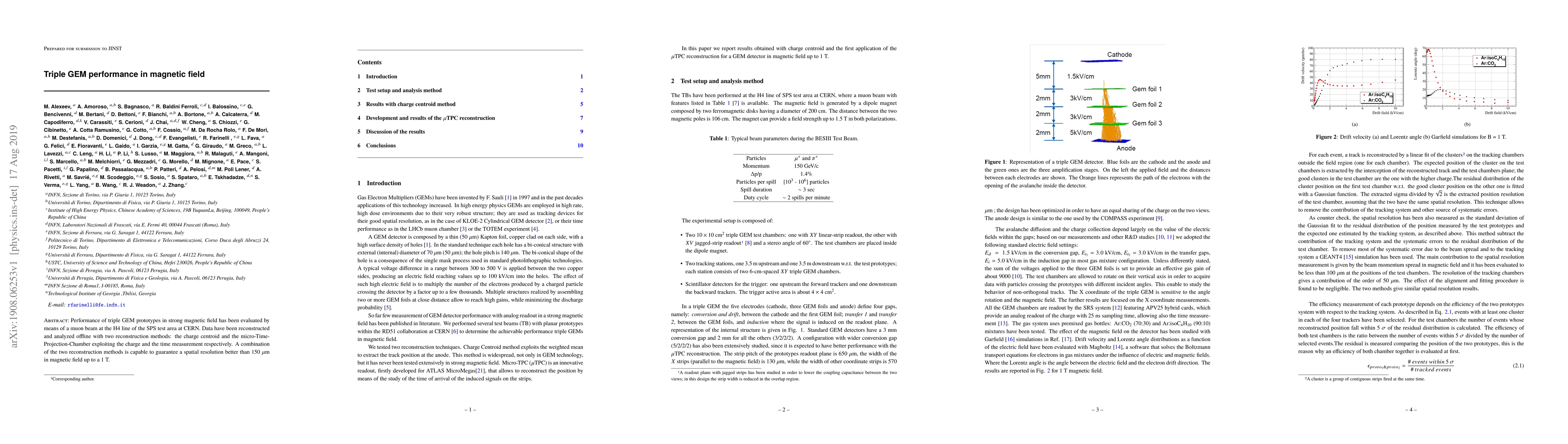 Performance of triple GEM prototypes in strong magnetic field has been evaluated bymeans of a muon beam at the H4 line of the SPS test area at CERN. Data have been reconstructedand analyzed offline with two reconstruction methods: the charge centroid and the micro-Time-Projection-Chamber exploiting the charge and the time measurement respectively. A combinationof the two reconstruction methods is capable to guarantee a spatial resolution better than 150{\mu}min magnetic field up to a 1 T.