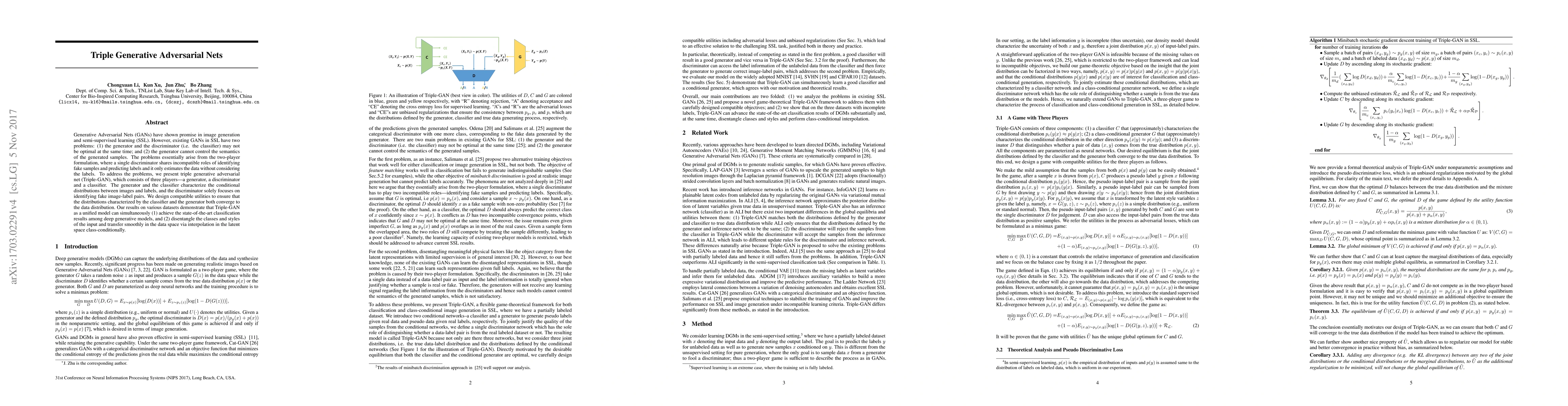 Generative Adversarial Nets (GANs) have shown promise in image generation and semi-supervised learning (SSL). However, existing GANs in SSL have two problems: (1) the generator and the discriminator (i.e. the classifier) may not be optimal at the same time; and (2) the generator cannot control the semantics of the generated samples. The problems essentially arise from the two-player formulation, where a single discriminator shares incompatible roles of identifying fake samples and predicting labels and it only estimates the data without considering the labels. To address the problems, we present triple generative adversarial net (Triple-GAN), which consists of three players---a generator, a discriminator and a classifier. The generator and the classifier characterize the conditional distributions between images and labels, and the discriminator solely focuses on identifying fake image-label pairs. We design compatible utilities to ensure that the distributions characterized by the classifier and the generator both converge to the data distribution. Our results on various datasets demonstrate that Triple-GAN as a unified model can simultaneously (1) achieve the state-of-the-art classification results among deep generative models, and (2) disentangle the classes and styles of the input and transfer smoothly in the data space via interpolation in the latent space class-conditionally.