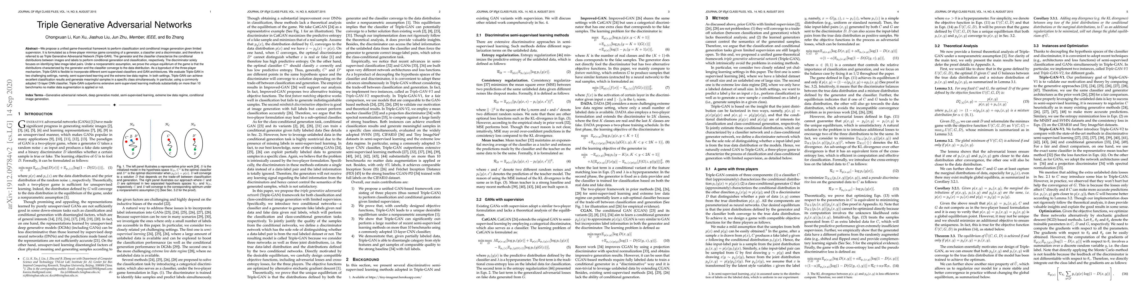 Triple Generative Adversarial Networks (Triple-GAN) is a new framework for classification and conditional image generation with limited supervision, outperforming traditional methods in semi-supervised learning and low data regimes.