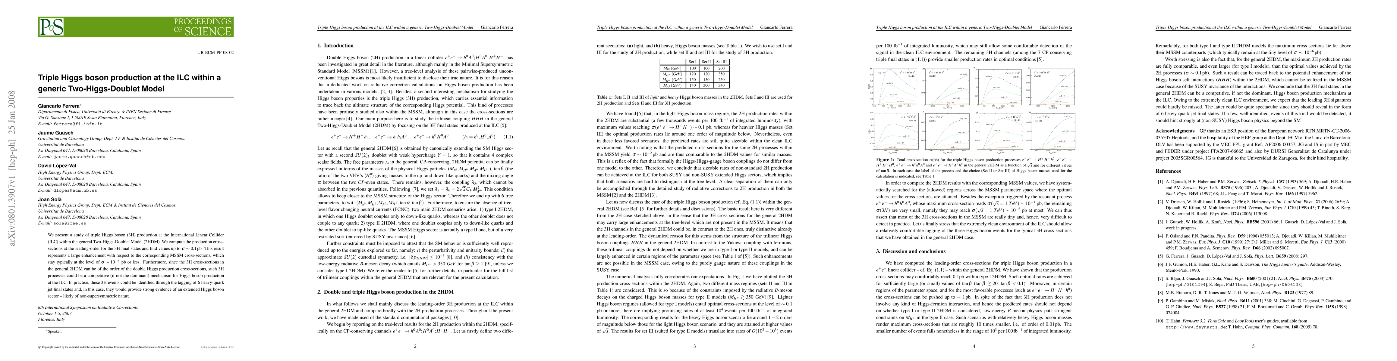 This paper investigates triple Higgs boson production at the ILC within the general Two-Higgs-Doublet Model, finding cross-sections up to 0.1 pb. These values significantly surpass those in the MSSM, suggesting 3H processes could be a dominant mechanism for Higgs production at the ILC, indicating a non-supersymmetric extended Higgs sector.