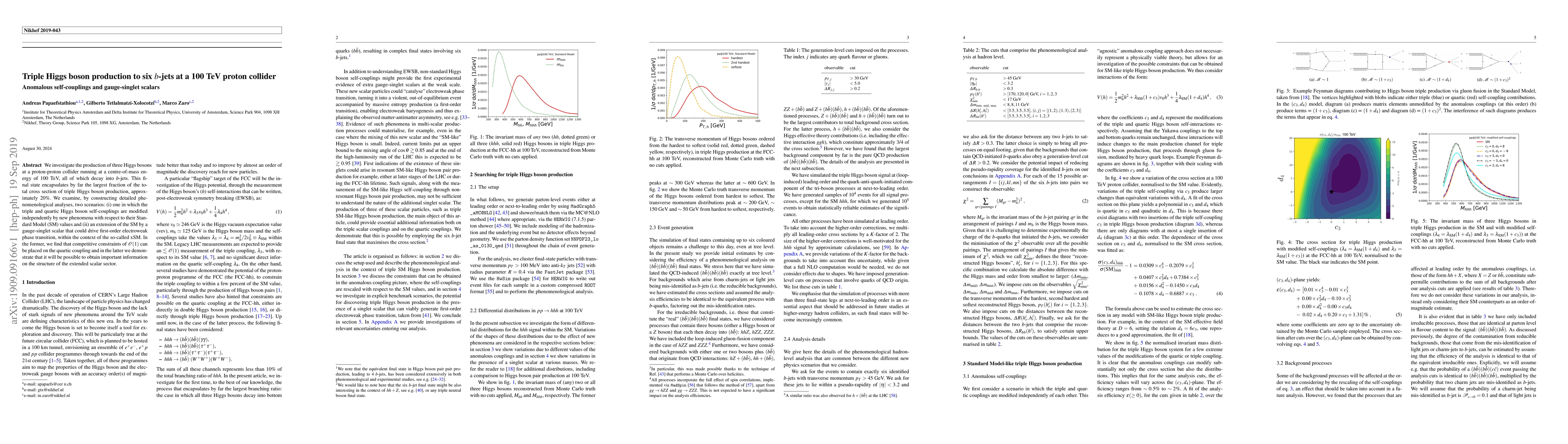 We investigate the production of three Higgs bosons at a proton-proton collider running at a centre-of-mass energy of 100 TeV, all of which decay into $b$-jets. This final state encapsulates by far the largest fraction of the total cross section of triple Higgs boson production, approximately $20\%$. We examine, by constructing detailed phenomenological analyses, two scenarios: (i) one in which the triple and quartic Higgs boson self-couplings are modified independently by new phenomena with respect to their Standard Model (SM) values and (ii) an extension of the SM by a gauge-singlet scalar that could drive first-order electroweak phase transition, within the context of the so-called xSM. In the former, we find that competitive constraints of $\mathcal{O}(1)$ can be placed on the quartic coupling and in the latter we demonstrate that it will be possible to obtain important information on the structure of the extended scalar sector.