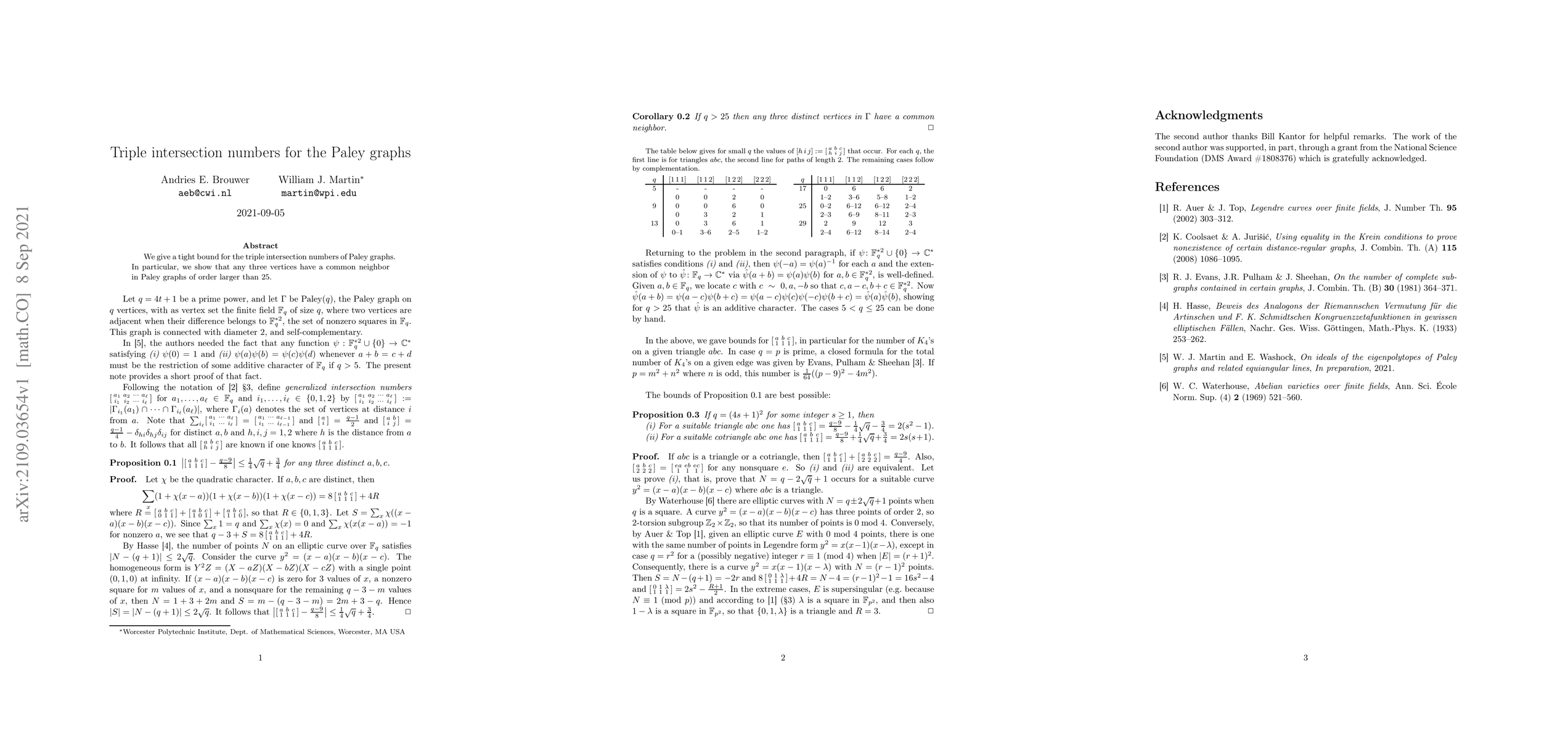 Summary: This paper establishes a tight bound for the triple intersection numbers in Paley graphs, demonstrating that any three vertices share a common neighbor in Paley graphs with an order greater than 25.
