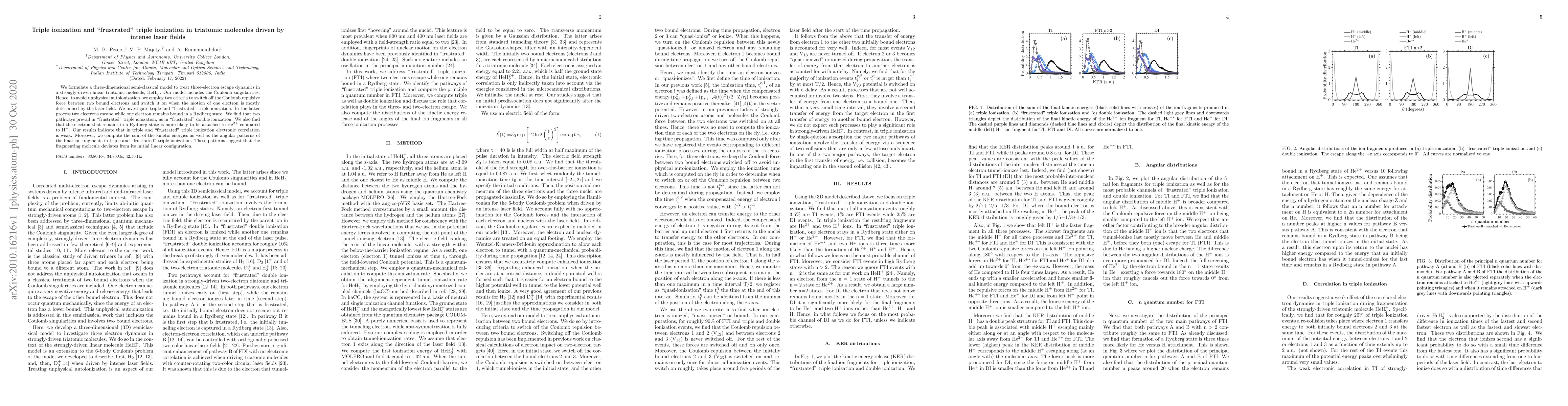 This paper develops a semi-classical model to study triple ionization in triatomic HeH$_{2}^{+}$ molecules under intense laser fields, identifying two pathways for "frustrated" triple ionization where two electrons escape while one remains bound. The study reveals weak electronic correlation and non-linear configurations of the final ion fragments.