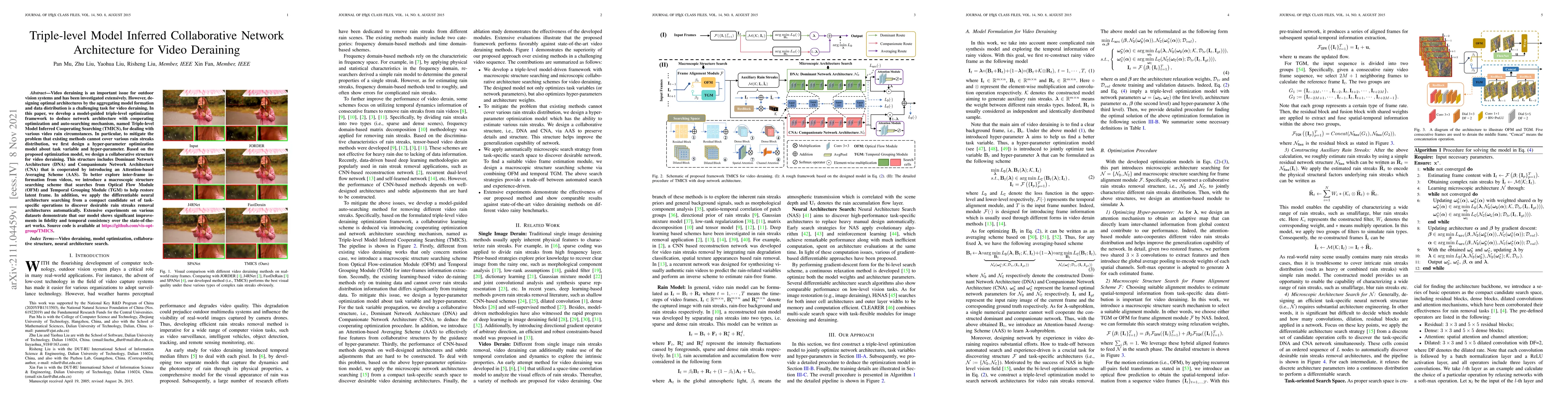 This paper proposes a novel optimization framework called Triple-level Model Inferred Cooperating Searching (TMICS) to design optimal architectures for video deraining, achieving significant improvements in fidelity and temporal consistency over state-of-the-art methods.