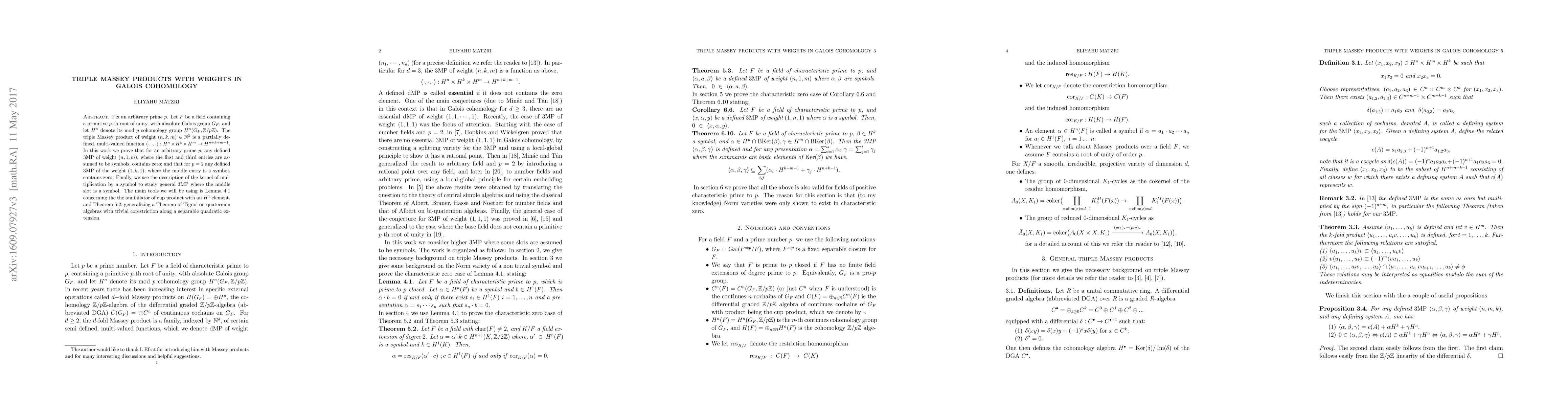 This paper investigates triple Massey products in Galois cohomology for fields containing a primitive $p$-th root of unity, proving that certain triple Massey products involving symbols yield zero. Key results include that any defined triple Massey product of weight $(n,1,m)$ contains zero, and for $p=2$, any defined $(1,k,1)$ product with the middle entry as a symbol also contains zero. The research utilizes Lemma 4.1 and Theorem 5.2 to study these structures.
