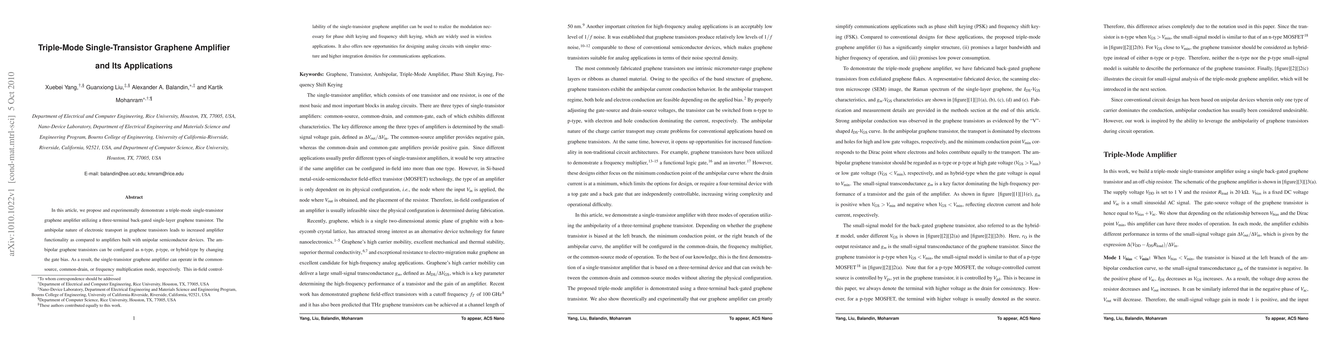 This paper proposes a triple-mode single-transistor graphene amplifier that operates in common-source, common-drain, or frequency multiplication modes, leveraging the ambipolar nature of graphene transistors. The device's versatility enables applications in phase shift keying and frequency shift keying for wireless communications.