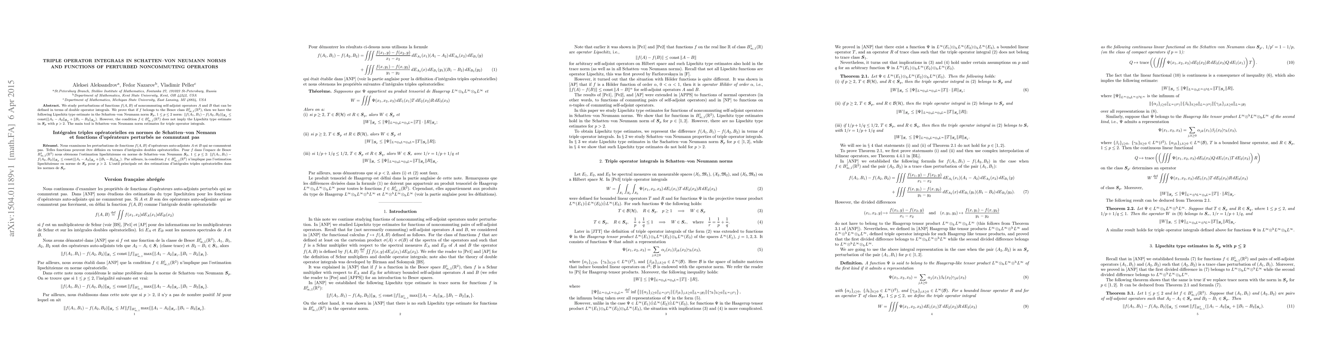 This research investigates perturbations of functions involving noncommuting self-adjoint operators, establishing a Lipschitz-type estimate in Schatten-von Neumann norms for functions within the Besov class $B_{\be,1}^1(\R^2)$. The study also highlights the importance of triple operator integral estimates for understanding operator perturbations.