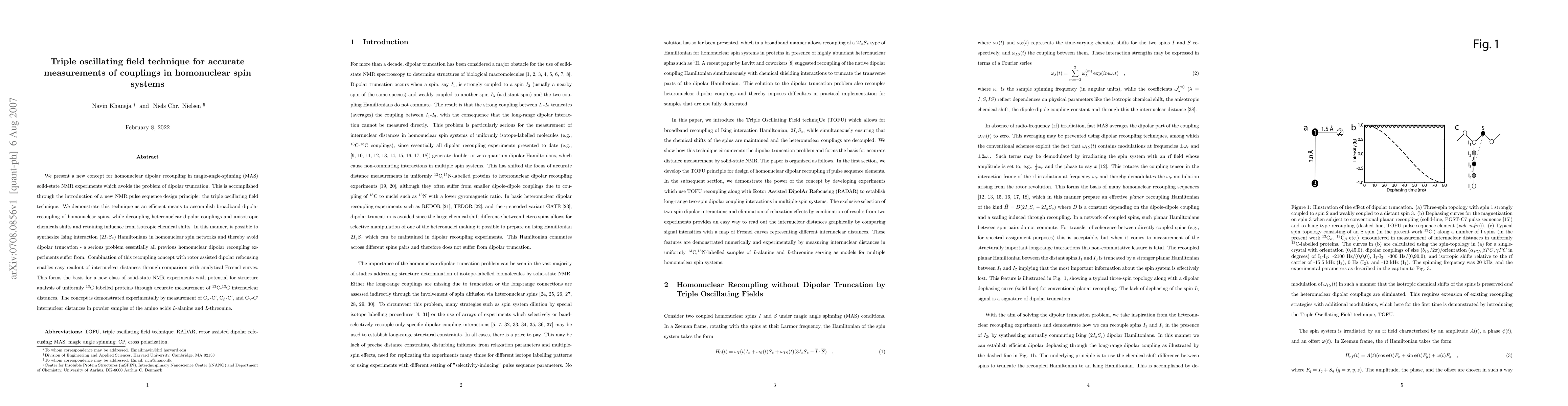 The paper introduces a novel triple oscillating field technique for homonuclear dipolar recoupling in solid-state NMR, effectively avoiding dipolar truncation and enabling accurate measurement of {13}C-{13}C internuclear distances in uniformly carbon-labelled proteins. This method combines with rotor-assisted refocusing for structure analysis, demonstrated experimentally on L-alanine and L-threonine.