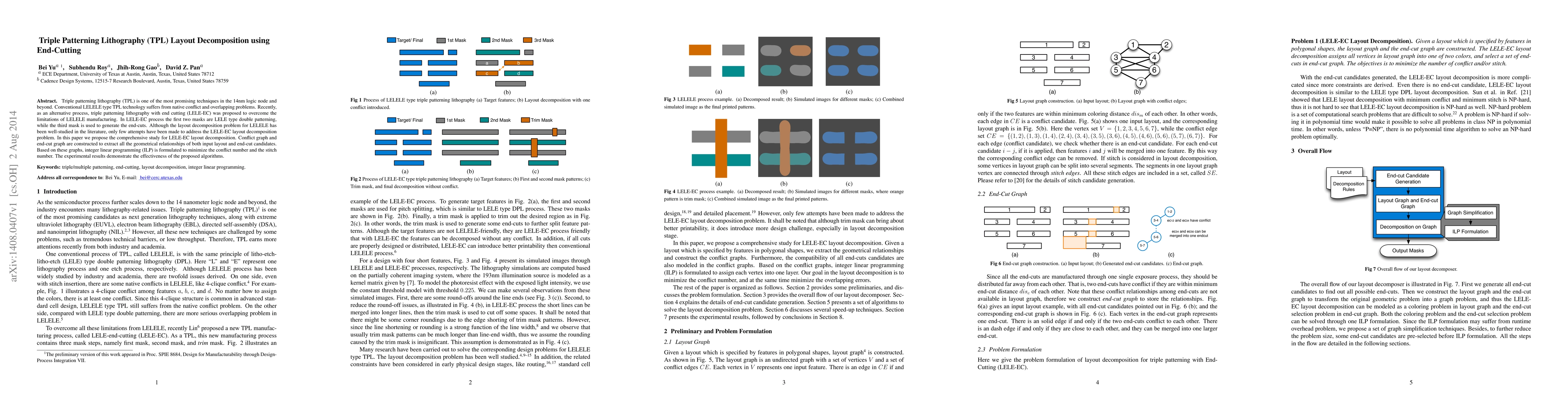 This paper proposes a novel approach for layout decomposition in Triple Patterning Lithography with end cutting (LELE-EC) to address the limitations of traditional LELELE TPL. It constructs conflict and end-cut graphs to minimize conflicts and stitch numbers, using integer linear programming, and demonstrates its effectiveness through experiments.