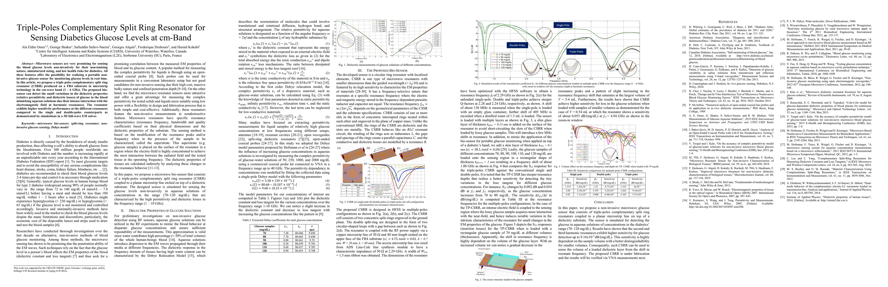 Microwave sensors are very promising for sensing the blood glucose levels non-invasively for their non-ionizing nature, miniaturized sizing, and low health risks for diabetics. All these features offer the possibility for realizing a portable non-invasive glucose sensor for monitoring glucose levels in real time. In this article, we propose a triple poles complementary split ring resonator (CSRR) produced on a FR4 substrate in microstrip technology in the cm-wave band (1-6 GHz). The proposed bio-sensor can detect the small variations in the dielectric properties (relative permittivity and dielectric losses) of glucose in the blood mimicking aqueous solutions due their intense interaction with the electromagnetic field at harmonic resonances. The resonator exhibits higher sensitivity performance at the different resonances compared to the single and double-poles counterparts as demonstrated by simulations in a 3D full-wave EM solver.