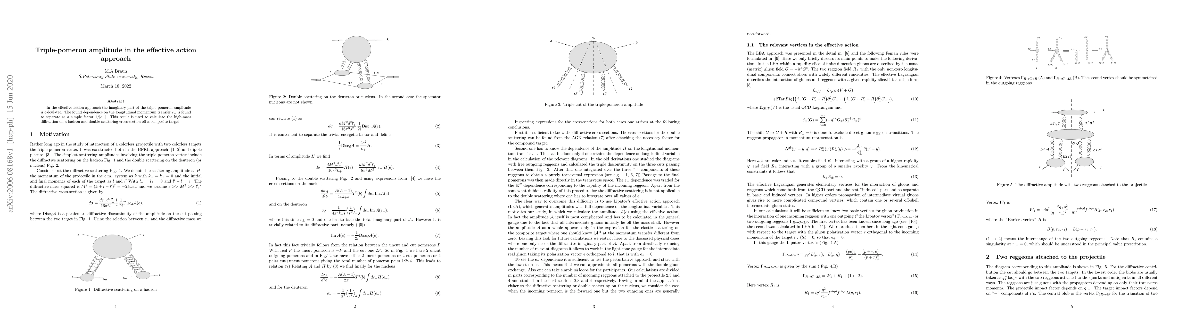 The research calculates the imaginary part of the triple pomeron amplitude in the effective action approach, revealing a $1/|\e|$ dependence on the longitudinal momentum transfer. This finding is applied to determine high-mass diffraction on hadrons and double scattering cross-sections on composite targets.