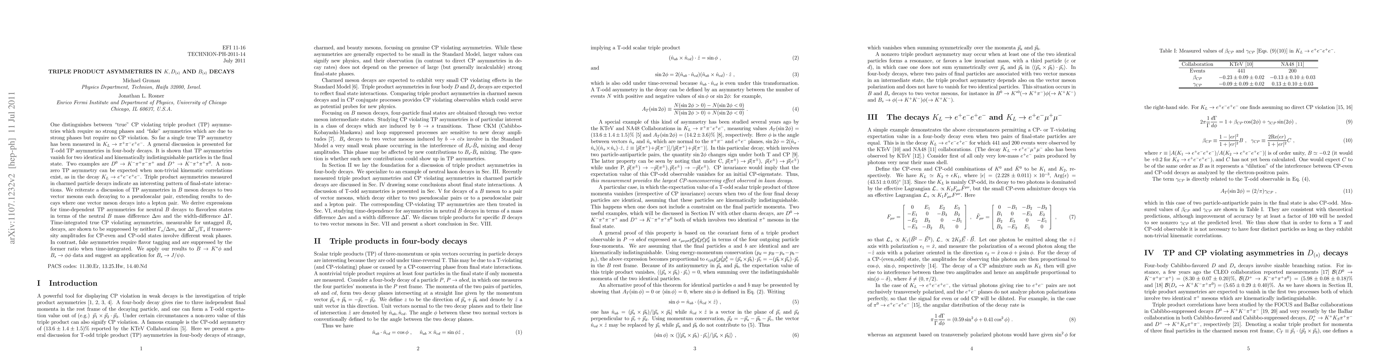 This paper discusses true and fake CP violating triple product asymmetries in $K$, $D_s$, and $B_s$ decays, highlighting that true asymmetries require no strong phases while fake asymmetries arise from them. It explores specific decay patterns and derives expressions for time-dependent asymmetries in neutral B decays, suggesting applications for $B\to K^*\phi$, $B_s\to\phi\phi$, and $B_s\to J/\psi\phi$.