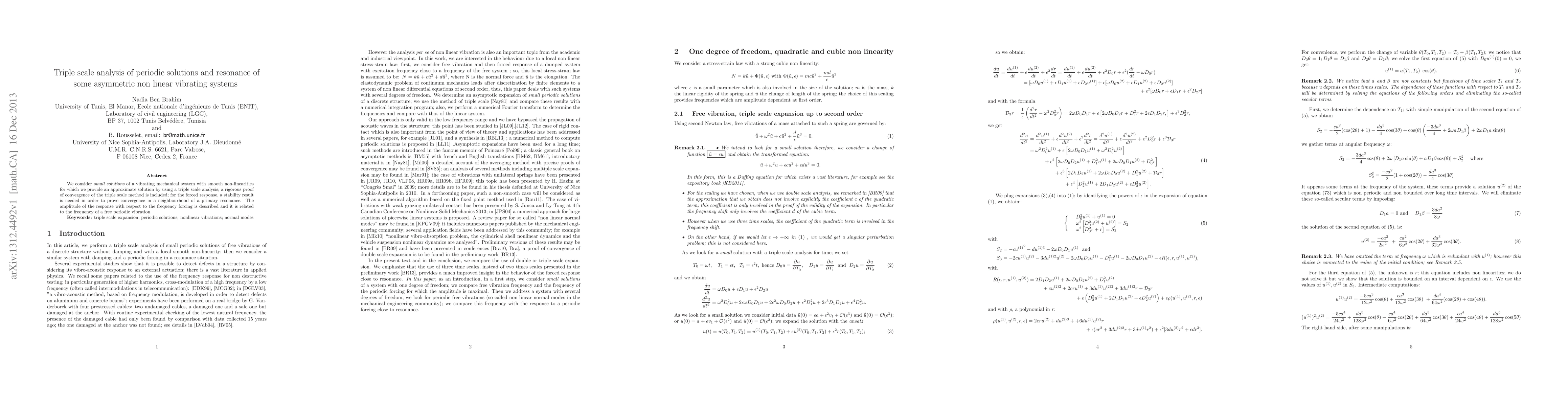 This paper employs triple scale analysis to approximate small solutions for asymmetric nonlinear vibrating systems with smooth non-linearities, providing a rigorous proof of the method's convergence. It also discusses the stability and amplitude of the forced response near primary resonance, linking it to the frequency of free periodic vibrations.