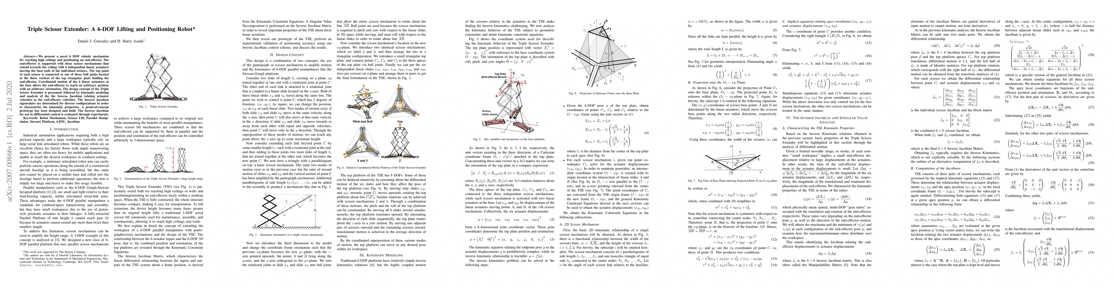 The Triple Scissor Extender is a 6-DOF robotic mechanism utilizing three scissor mechanisms for ceiling-reaching and end-effector positioning. The prototype's kinematic properties and controllability are analyzed through the Inverse Jacobian, validated by experimental results.