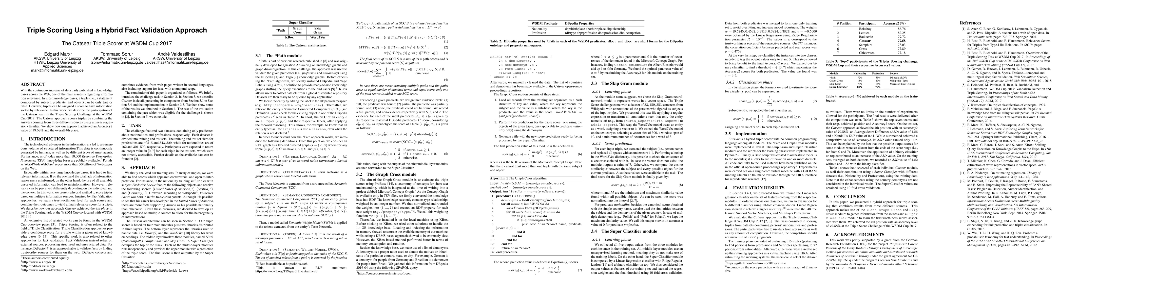With the continuous increase of data daily published in knowledge bases across the Web, one of the main issues is regarding information relevance. In most knowledge bases, a triple (i.e., a statement composed by subject, predicate, and object) can be only true or false. However, triples can be assigned a score to have information sorted by relevance. In this work, we describe the participation of the Catsear team in the Triple Scoring Challenge at the WSDM Cup 2017. The Catsear approach scores triples by combining the answers coming from three different sources using a linear regression classifier. We show how our approach achieved an Accuracy2 value of 79.58% and the overall 4th place.