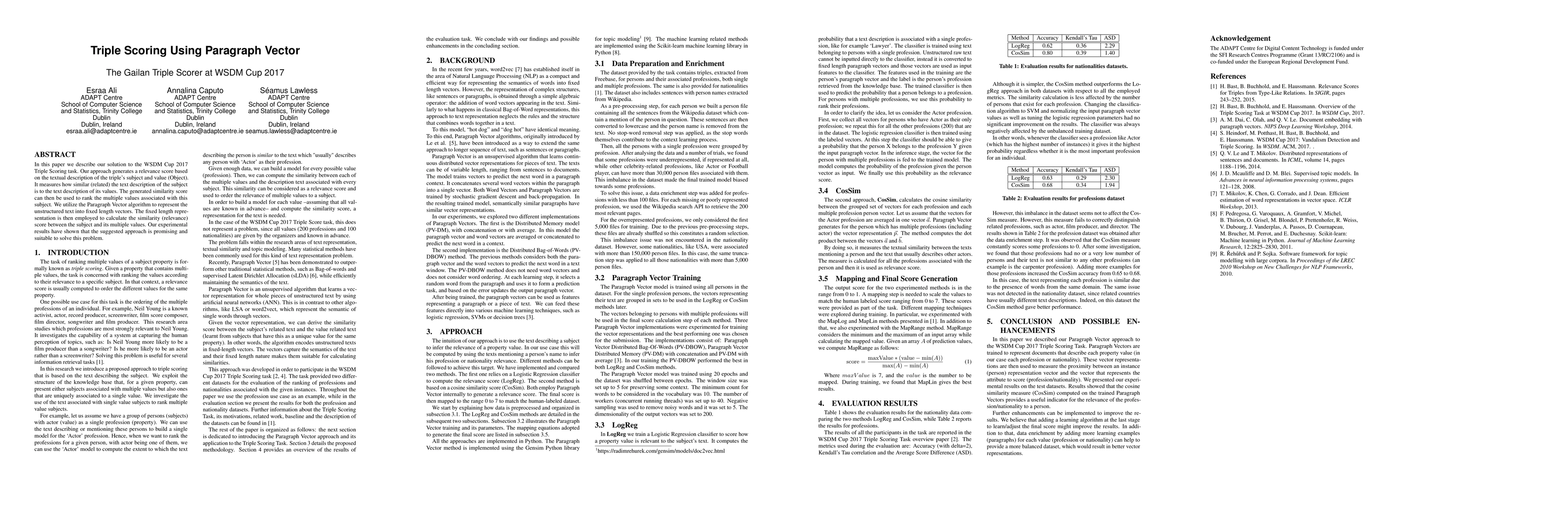 In this paper we describe our solution to the WSDM Cup 2017 Triple Scoring task. Our approach generates a relevance score based on the textual description of the triple's subject and value (Object). It measures how similar (related) the text description of the subject is to the text description of its values. The generated similarity score can then be used to rank the multiple values associated with this subject. We utilize the Paragraph Vector algorithm to represent the unstructured text into fixed length vectors. The fixed length representation is then employed to calculate the similarity (relevance) score between the subject and its multiple values. Our experimental results have shown that the suggested approach is promising and suitable to solve this problem.