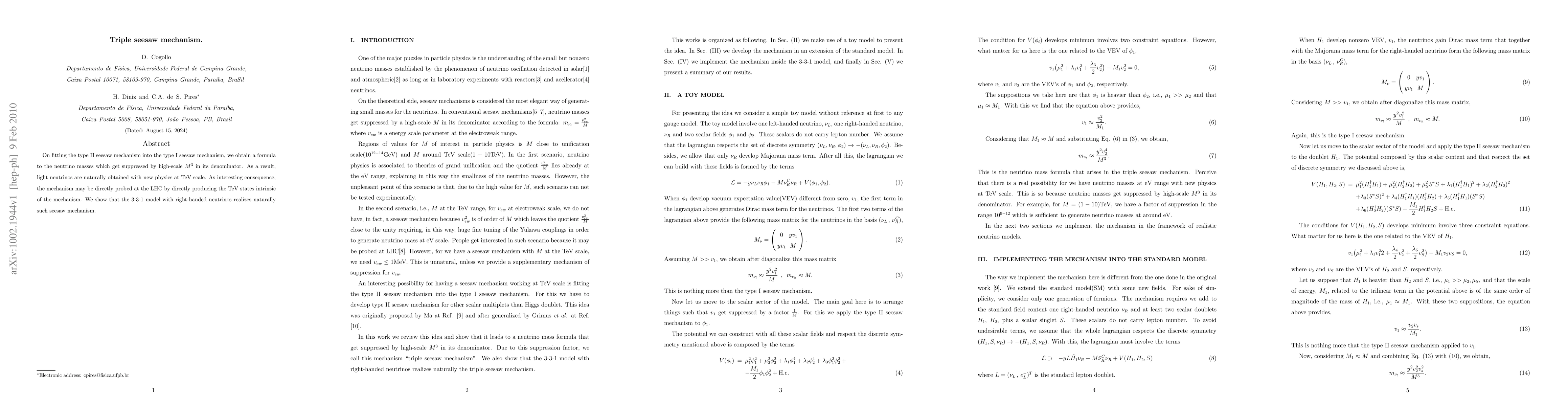 The paper proposes a triple seesaw mechanism that combines type I and type II seesaw mechanisms, resulting in suppressed neutrino masses and naturally light neutrinos at the TeV scale. This mechanism can be directly probed at the LHC, and it is realized in the 3-3-1 model with right-handed neutrinos.