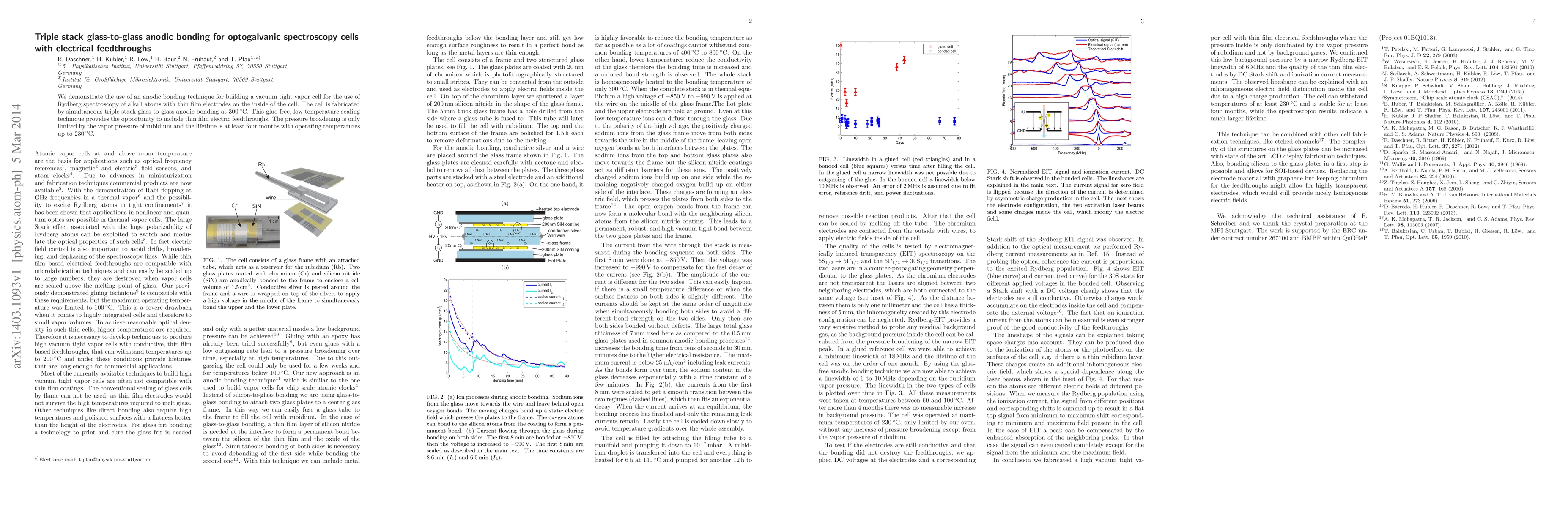 This paper presents a triple stack glass-to-glass anodic bonding method for creating vacuum-tight vapor cells for Rydberg spectroscopy, featuring thin film electrodes and electrical feedthroughs. The low-temperature, glue-free bonding technique allows for stable operation at temperatures up to 230°C with a cell lifetime of at least four months.