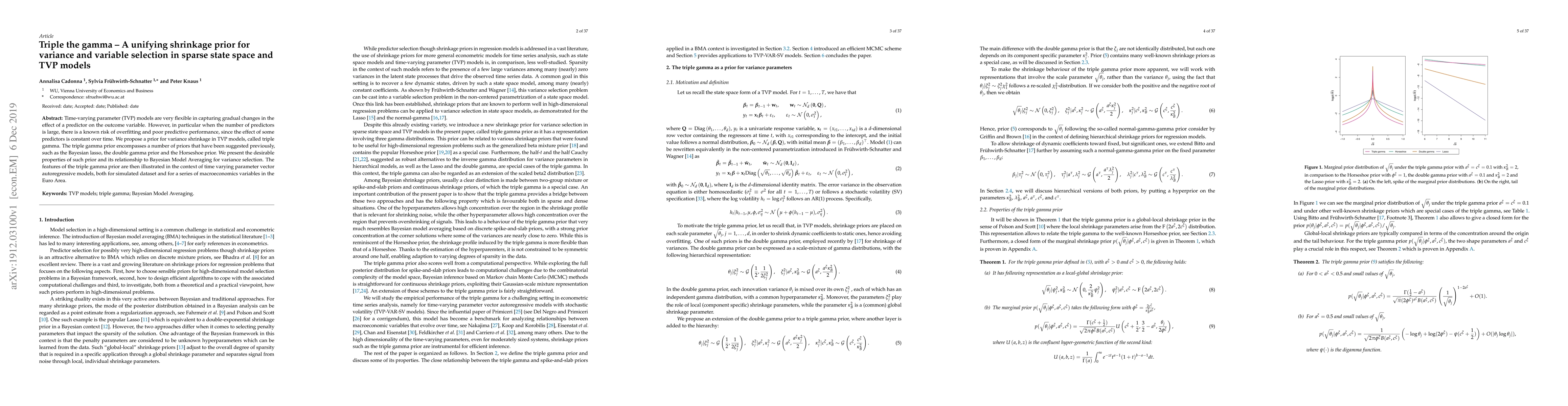 Time-varying parameter (TVP) models are very flexible in capturing gradual changes in the effect of a predictor on the outcome variable. However, in particular when the number of predictors is large, there is a known risk of overfitting and poor predictive performance, since the effect of some predictors is constant over time. We propose a prior for variance shrinkage in TVP models, called triple gamma. The triple gamma prior encompasses a number of priors that have been suggested previously, such as the Bayesian lasso, the double gamma prior and the Horseshoe prior. We present the desirable properties of such a prior and its relationship to Bayesian Model Averaging for variance selection. The features of the triple gamma prior are then illustrated in the context of time varying parameter vector autoregressive models, both for simulated datasets and for a series of macroeconomics variables in the Euro Area.
