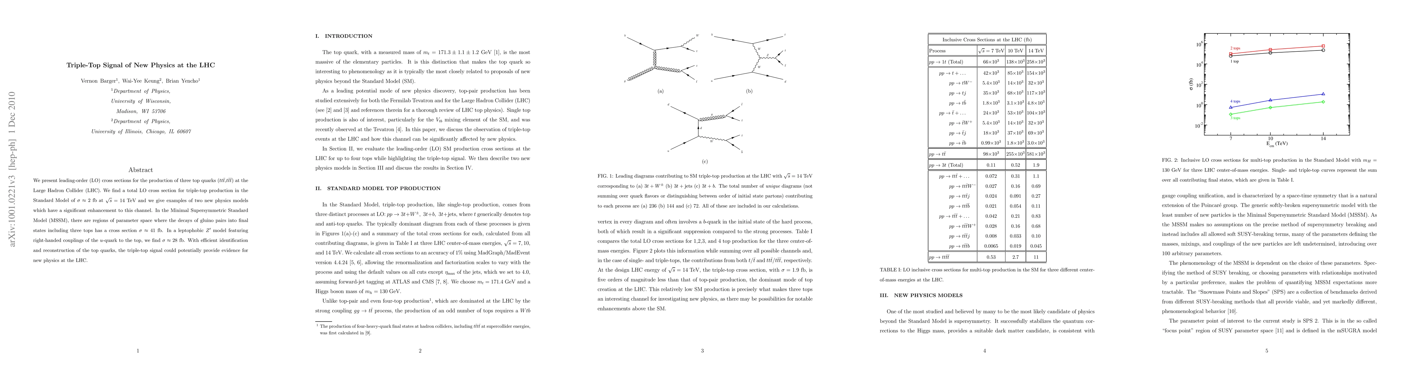 We present leading-order (LO) cross sections for the production of three top quarks ($tt\tb$,$t\tb\tb$) at the Large Hadron Collider (LHC). We find a total LO cross section for triple-top production in the Standard Model of $\sigma \approx 2 $ fb at $\sqrt{s}=14$ TeV and we give examples of two new physics models which have a significant enhancement to this channel. In the Minimal Supersymmetric Standard Model (MSSM), there are regions of parameter space where the decays of gluino pairs into final states including three tops has a cross section $\sigma \approx 41$ fb. In a leptophobic $Z'$ model featuring right-handed couplings of the $u$-quark to the top, we find $\sigma \approx 28$ fb. With efficient identification and reconstruction of the top quarks, the triple-top signal could potentially provide evidence for new physics at the LHC.
