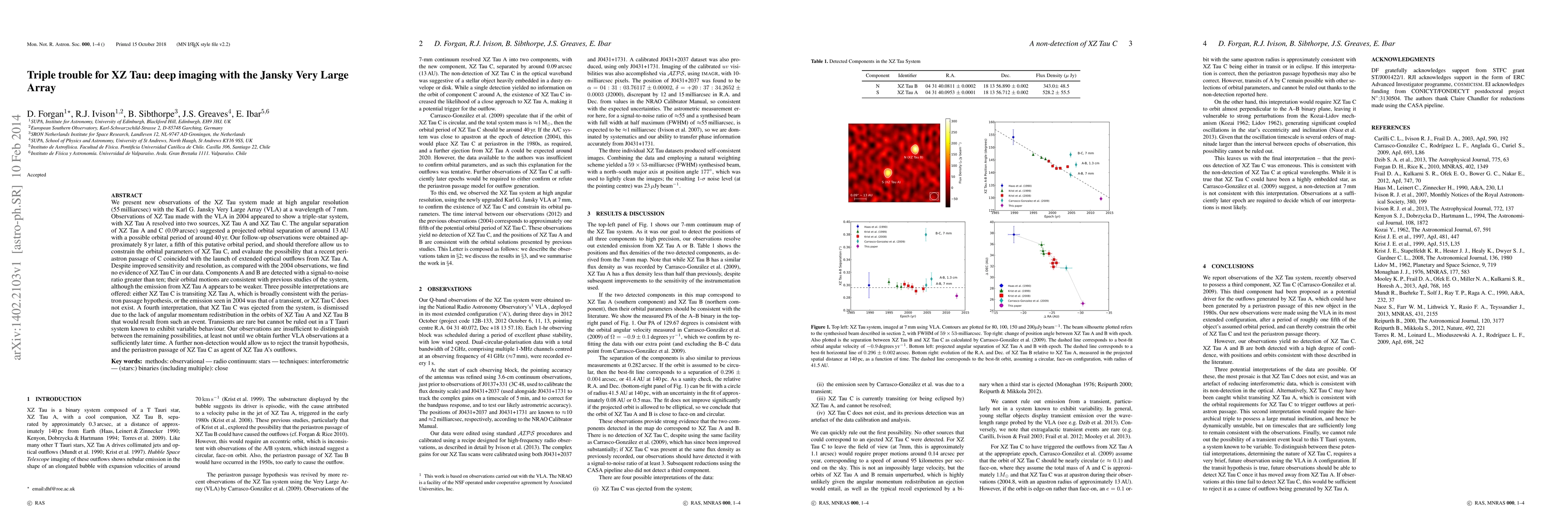 We present new observations of the XZ Tau system made at high angular resolution (55 milliarcsec) with the Karl G. Jansky Very Large Array (VLA) at a wavelength of 7 mm. Observations of XZ Tau made with the VLA in 2004 appeared to show a triple system, with XZ Tau A resolved into two sources, XZ Tau A and XZ Tau C. The angular separation of XZ Tau A and C (0.09 arcsec) suggested a projected orbital separation of around 13 AU with a possible orbital period of around 40 yr. Our observations were obtained approximately 8 yr later, a fifth of this putative orbital period, and should therefore allow us to constrain the orbit of XZ Tau C, and evaluate the possibility that a recent periastron passage of C coincided with the launch of extended optical outflows from XZ Tau A. Despite improved sensitivity and resolution compared with previous observations, we find no evidence of XZ Tau C in our data. Components A and B are detected with a signal-to-noise ratio greater than ten; their orbits are consistent with previous studies, although the emission from XZ Tau A appears to be weaker. Three possible interpretations are offered: either XZ Tau C is transiting XZ Tau A, which is broadly consistent with the periastron passage hypothesis, or the emission seen in 2004 was that of a transient, or XZ Tau C does not exist. A fourth interpretation, that XZ Tau C was ejected from the system, is dismissed due to the lack of angular momentum redistribution in the orbits of XZ Tau A and XZ Tau B that would result from such an event. Our observations are insufficient to distinguish between the remaining possibilities, at least not until we obtain further VLA observations at a sufficiently later time. A further non-detection would allow us to reject the transit hypothesis, and the periastron passage of XZ Tau C as agent of XZ Tau A's outflows.
