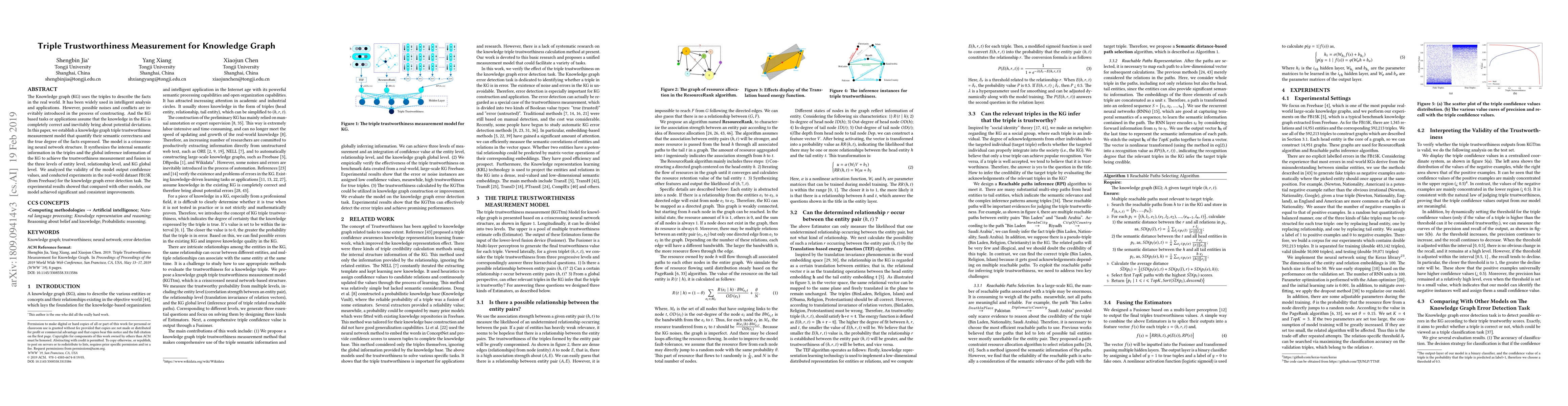 The Knowledge graph (KG) uses the triples to describe the facts in the real world. It has been widely used in intelligent analysis and applications. However, possible noises and conflicts are inevitably introduced in the process of constructing. And the KG based tasks or applications assume that the knowledge in the KG is completely correct and inevitably bring about potential deviations. In this paper, we establish a knowledge graph triple trustworthiness measurement model that quantify their semantic correctness and the true degree of the facts expressed. The model is a crisscrossing neural network structure. It synthesizes the internal semantic information in the triples and the global inference information of the KG to achieve the trustworthiness measurement and fusion in the three levels of entity level, relationship level, and KG global level. We analyzed the validity of the model output confidence values, and conducted experiments in the real-world dataset FB15K (from Freebase) for the knowledge graph error detection task. The experimental results showed that compared with other models, our model achieved significant and consistent improvements.