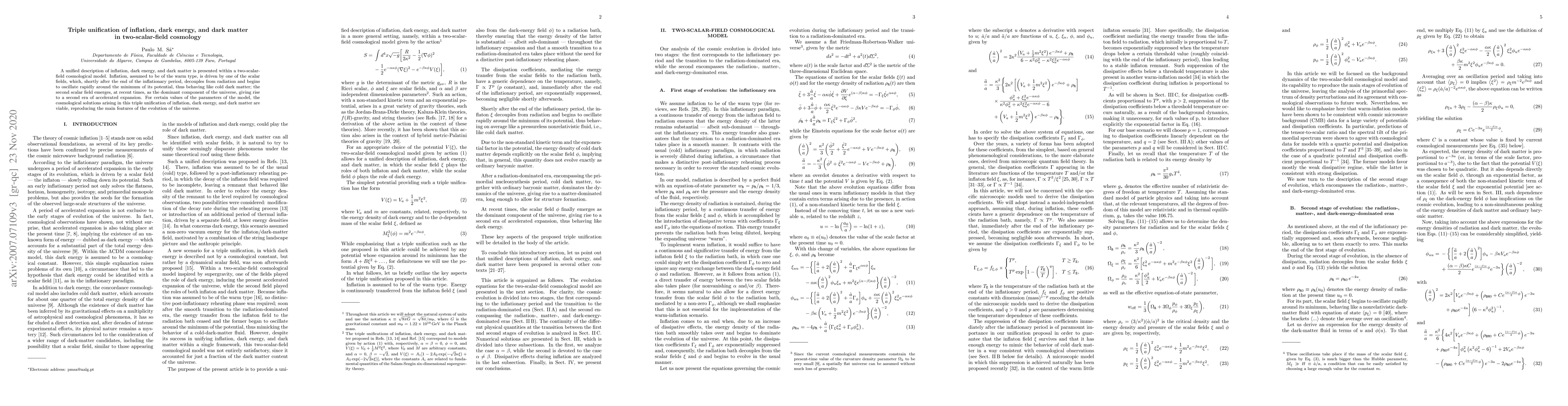 A unified description of inflation, dark energy, and dark matter is presented within a two-scalar-field cosmological model. Inflation, assumed to be of the warm type, is driven by one of the scalar fields, which, shortly after the end of the inflationary period, decouples from radiation and begins to oscillate rapidly around the minimum of its potential, thus behaving like cold dark matter; the second scalar field emerges, at recent times, as the dominant component of the universe, giving rise to a second era of accelerated expansion. For certain values of the parameters of the model, the cosmological solutions arising in this triple unification of inflation, dark energy, and dark matter are viable, reproducing the main features of the evolution of the universe.