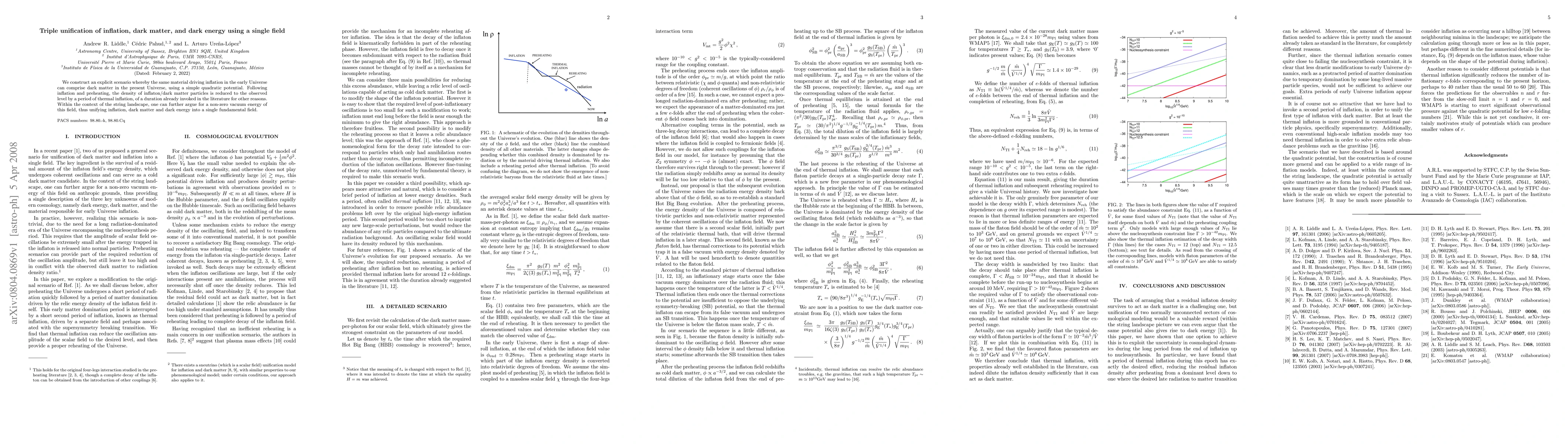 This paper proposes a unified model where a single field drives inflation, constitutes dark matter, and contributes to dark energy through a simple quadratic potential. It achieves this by incorporating a period of thermal inflation post-preheating to adjust the density of inflaton particles to match current observations.