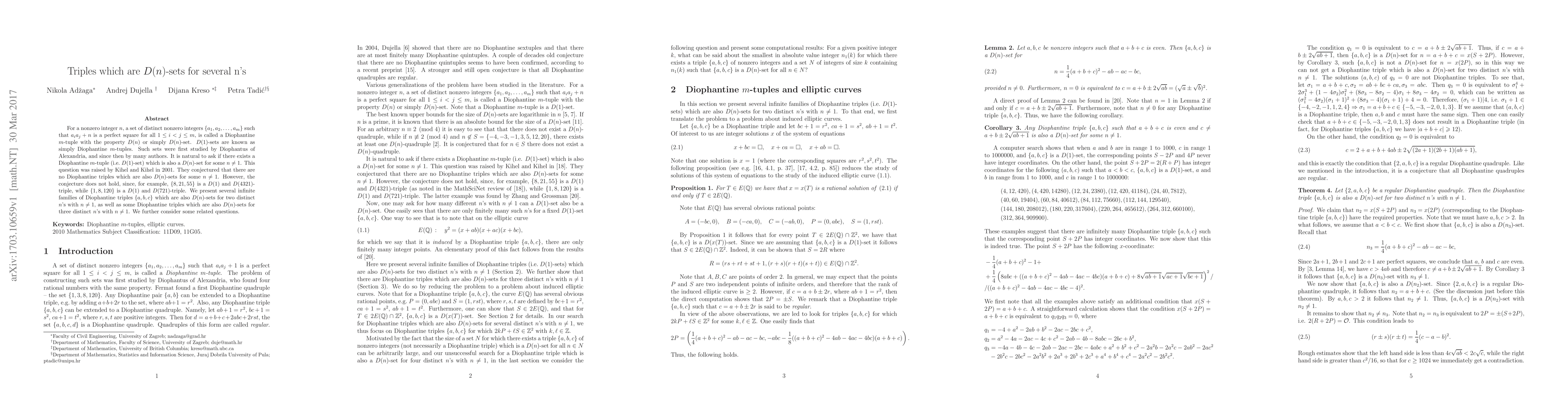 Researchers have found infinite families of Diophantine triples that are also D(n)-sets for two distinct n's with n != 1, as well as some sets that meet this criterion for three distinct n's.