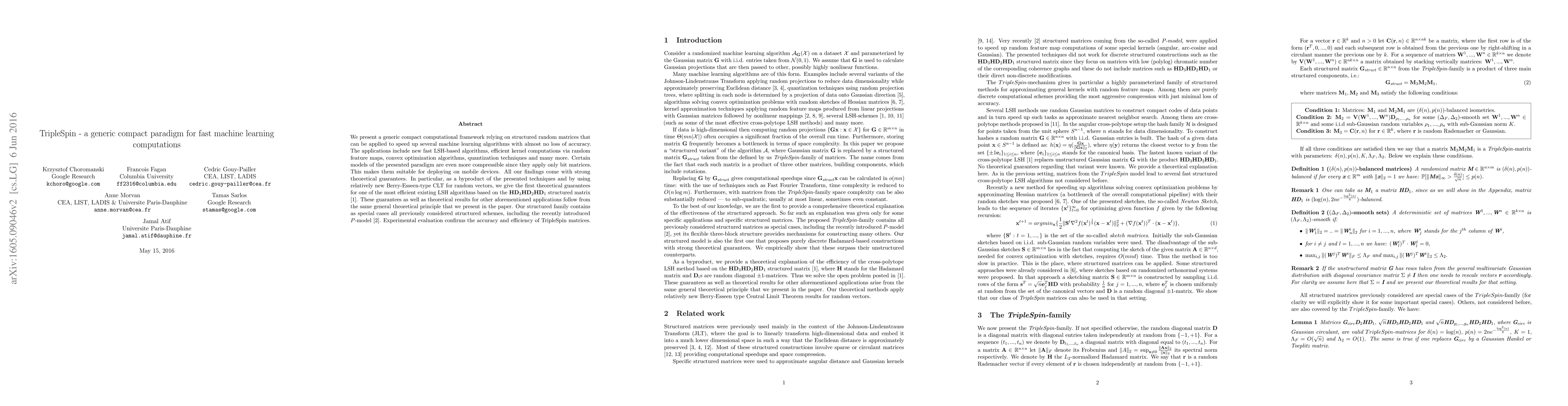 TripleSpin introduces a generic framework using structured random matrices to speed up various machine learning algorithms with minimal loss of accuracy, including LSH, kernel computations, and convex optimization. Theoretical guarantees and experimental validation confirm its efficiency and accuracy, especially for deployment on mobile devices.
