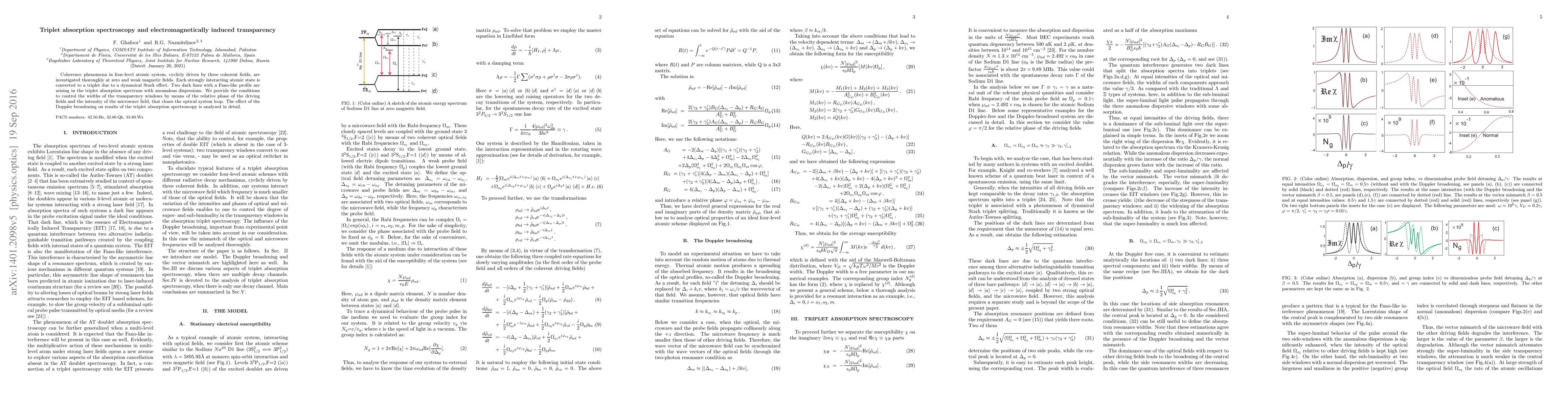 This paper investigates coherence phenomena in a four-level atomic system driven by three coherent fields, revealing two Fano-like dark lines in the triplet absorption spectrum with anomalous dispersions. The study provides control over transparency window widths via the relative phase and intensity of driving fields, and analyzes the impact of Doppler broadening on triplet absorption spectroscopy.