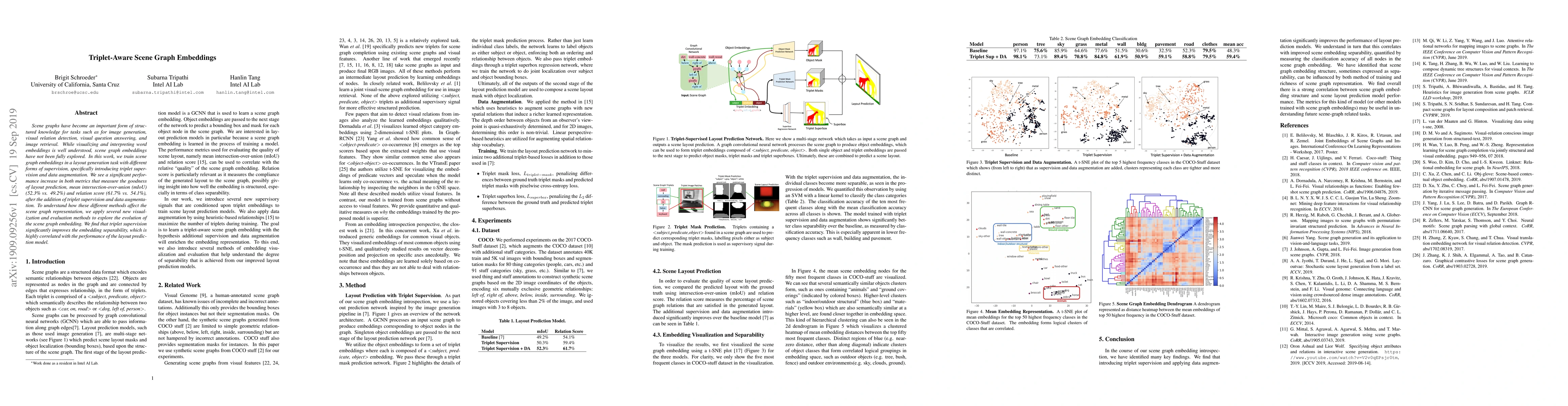 Scene graphs have become an important form of structured knowledge for tasks such as for image generation, visual relation detection, visual question answering, and image retrieval. While visualizing and interpreting word embeddings is well understood, scene graph embeddings have not been fully explored. In this work, we train scene graph embeddings in a layout generation task with different forms of supervision, specifically introducing triplet super-vision and data augmentation. We see a significant performance increase in both metrics that measure the goodness of layout prediction, mean intersection-over-union (mIoU)(52.3% vs. 49.2%) and relation score (61.7% vs. 54.1%),after the addition of triplet supervision and data augmentation. To understand how these different methods affect the scene graph representation, we apply several new visualization and evaluation methods to explore the evolution of the scene graph embedding. We find that triplet supervision significantly improves the embedding separability, which is highly correlated with the performance of the layout prediction model.