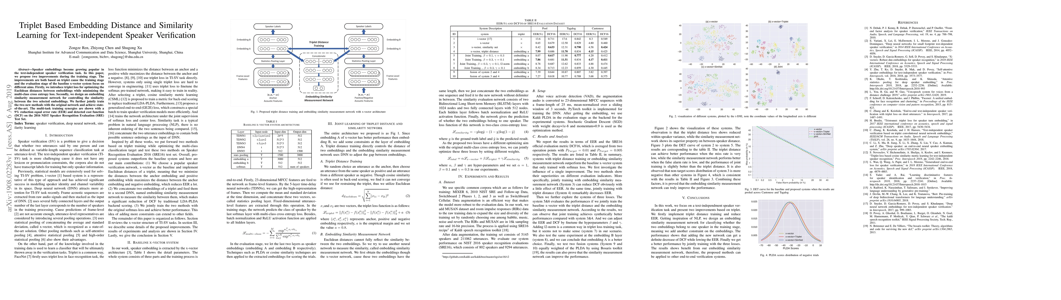The paper introduces triplet loss for speaker embedding optimization and an embedding similarity measurement network, enhancing text-independent speaker verification.